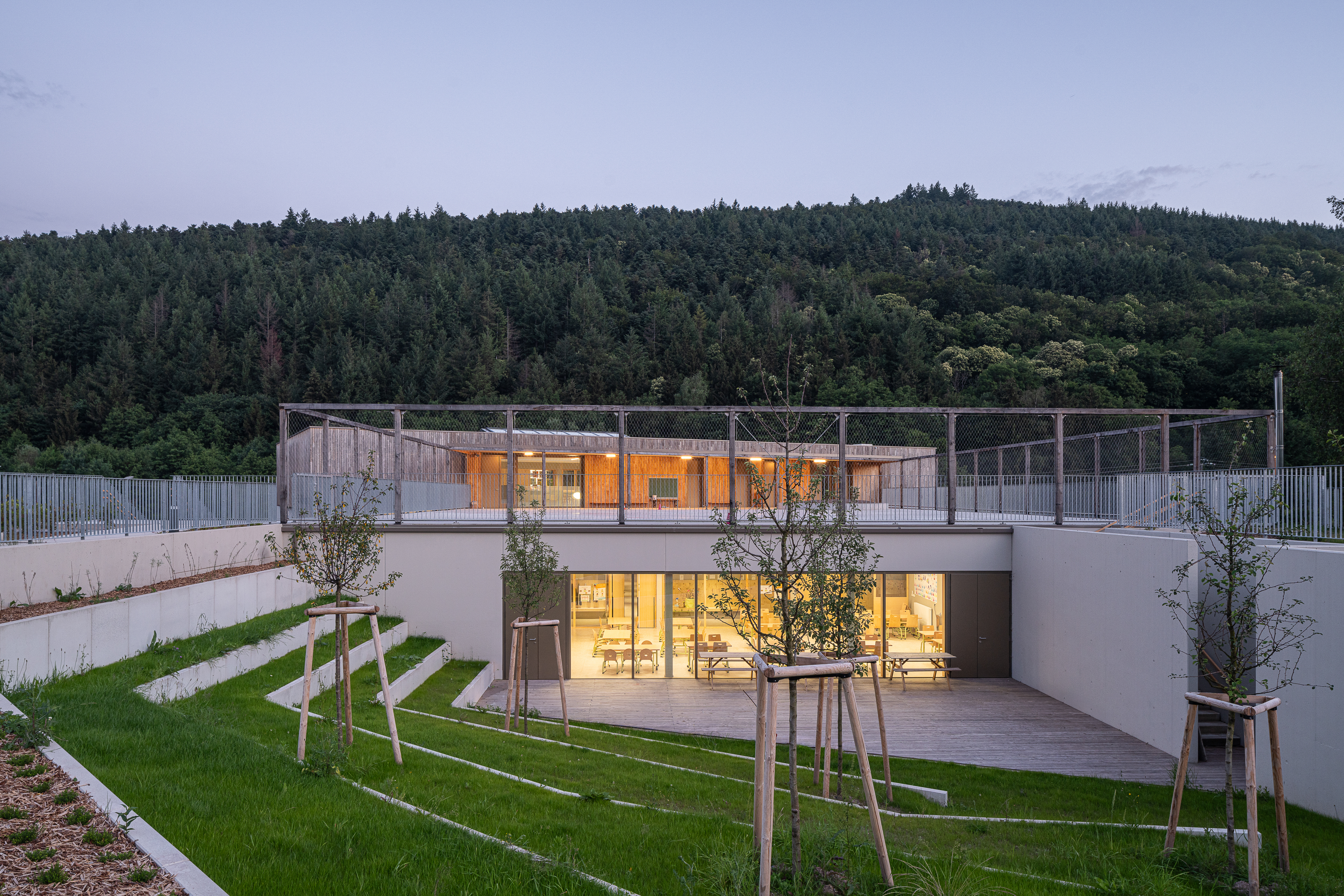 The simple, durable design combines a concrete base with a wooden façade, utilizing local chestnut wood, sourced from the surrounding forest. Natural light and ventilation play a vital role in creating a pleasant environment, with skylights and large windows framing the landscape. The restrained material palette leaves room for the children's work to animate and color the spaces.