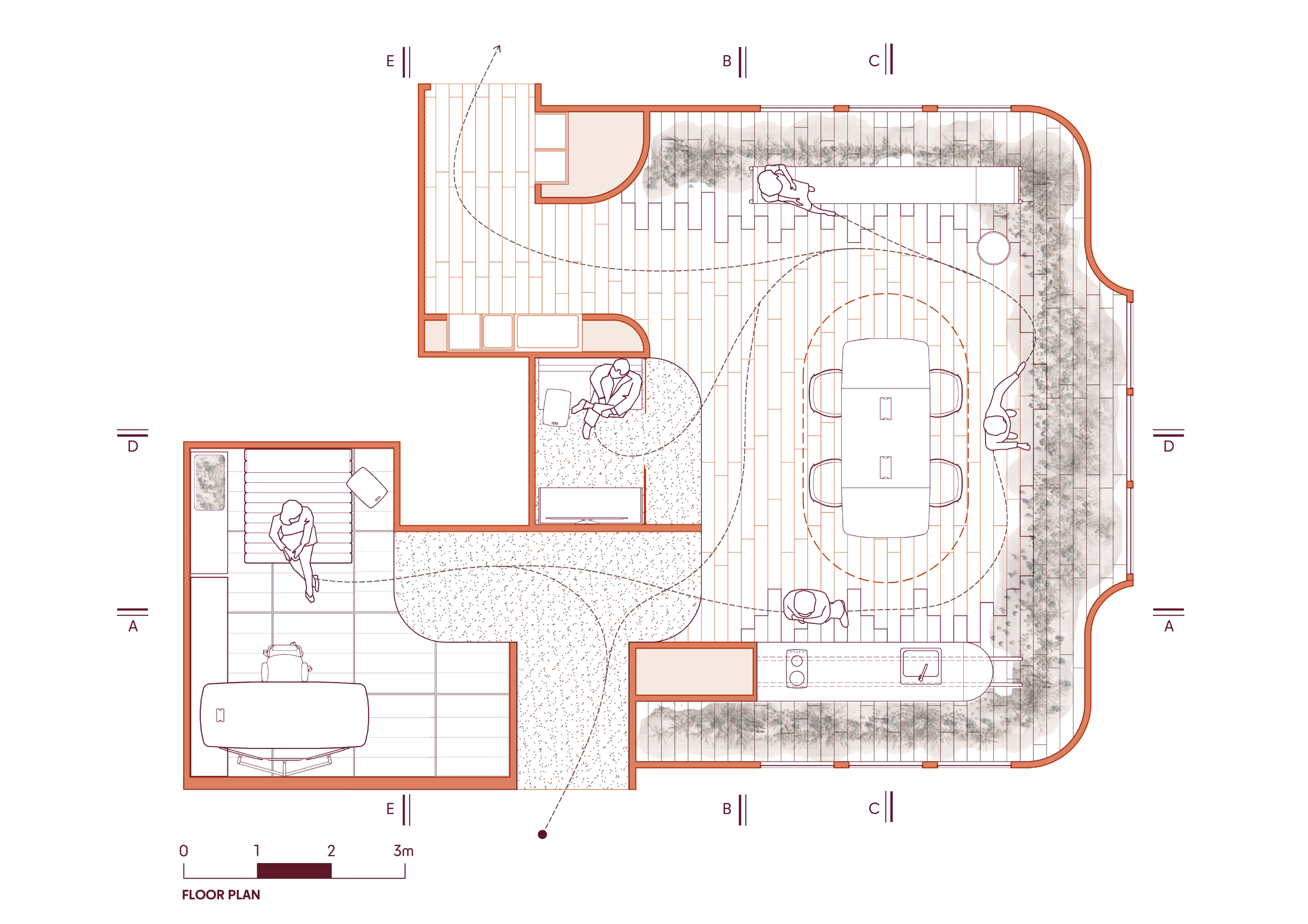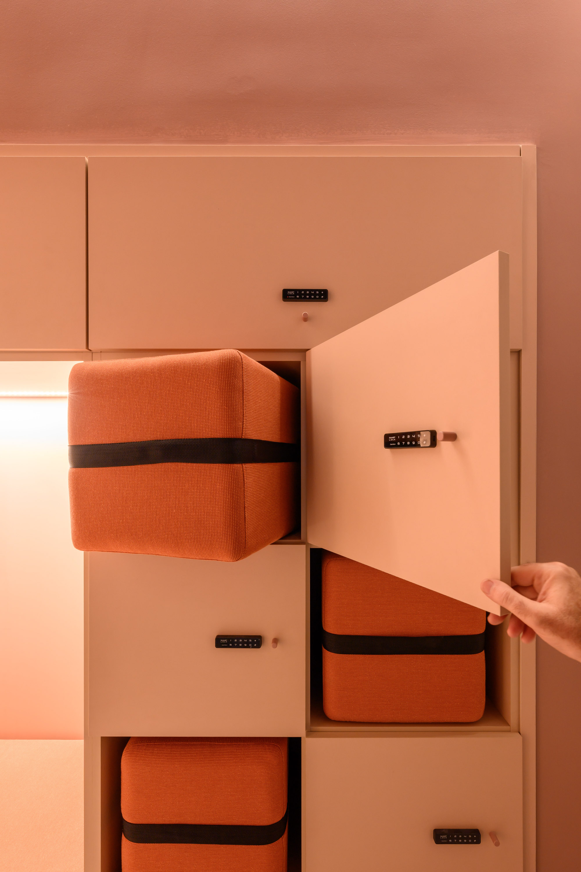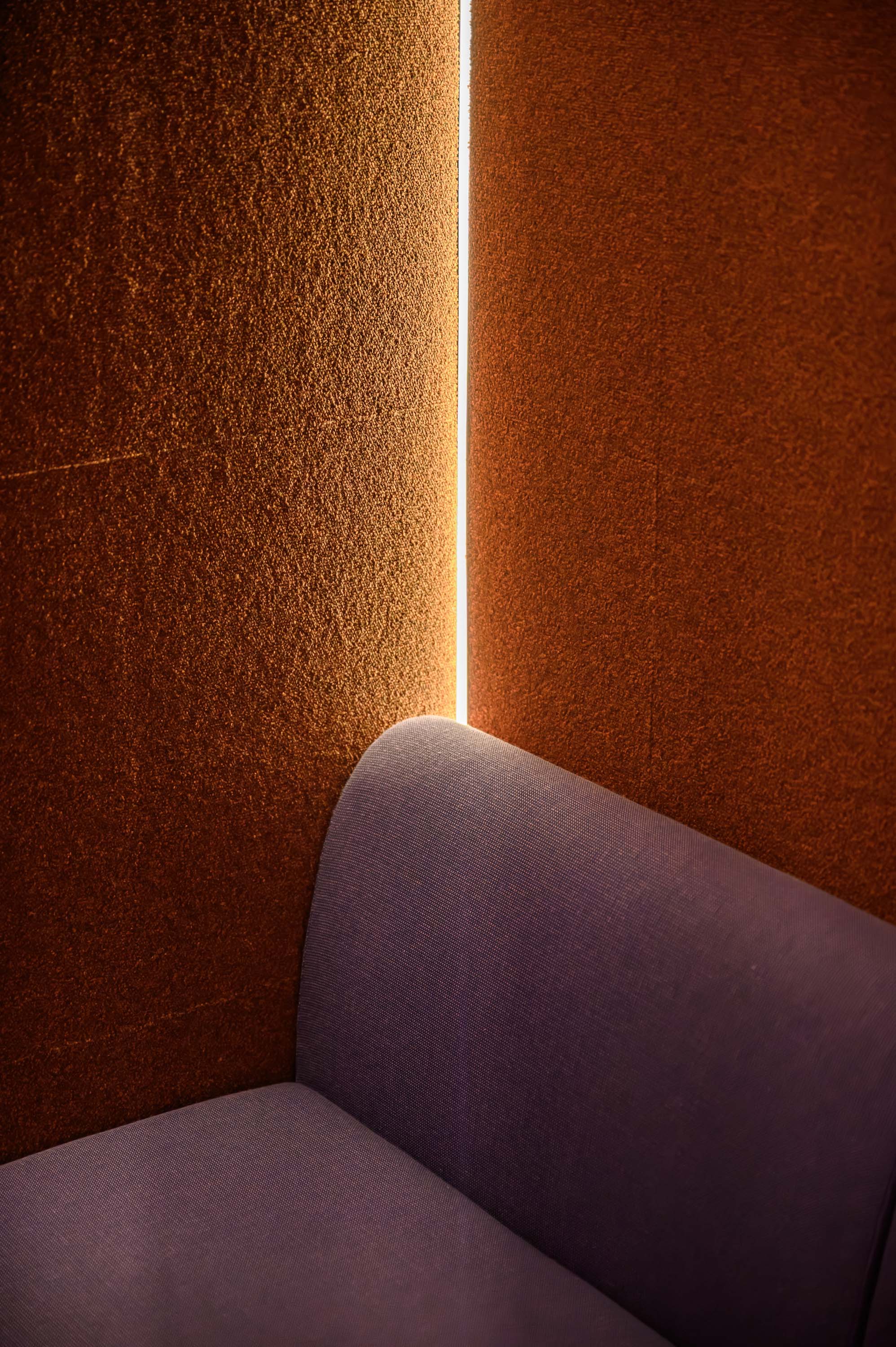 The immersive space features a luminous grid that simulates the grid of virtual reality and includes, on one side, a desk, and on the other, a chaise longue for resting and transporting us to a natural environment in virtual reality. This way, the real and virtual worlds are blended, integrating elements of both to form a hybrid reality, understanding that in the future our interaction with nature may primarily be virtual. Upon entering the central area, a change in scale is perceived due to its dimensions and height. This space is centered around the meeting table, framed by a large luminaire hanging from the ceiling. On one side, there is a kitchen that once again alludes to the blurred boundary between home and office, while on the opposite side, there is a large hanging bench for contemplation. The windowless space posed a great challenge for the Ebras studio, who created a series of oval windows in collaboration with a light plastic artist, providing a glimpse of an urban sunset outside. The dry vegetation that runs along the perimeter of the space recreates a mountainous, wild, and arid landscape typical of the area.