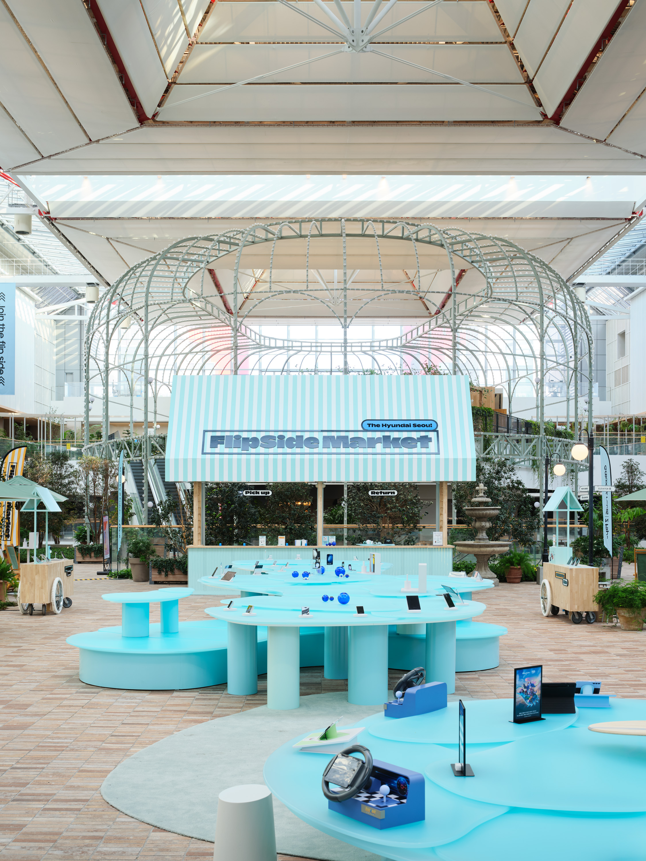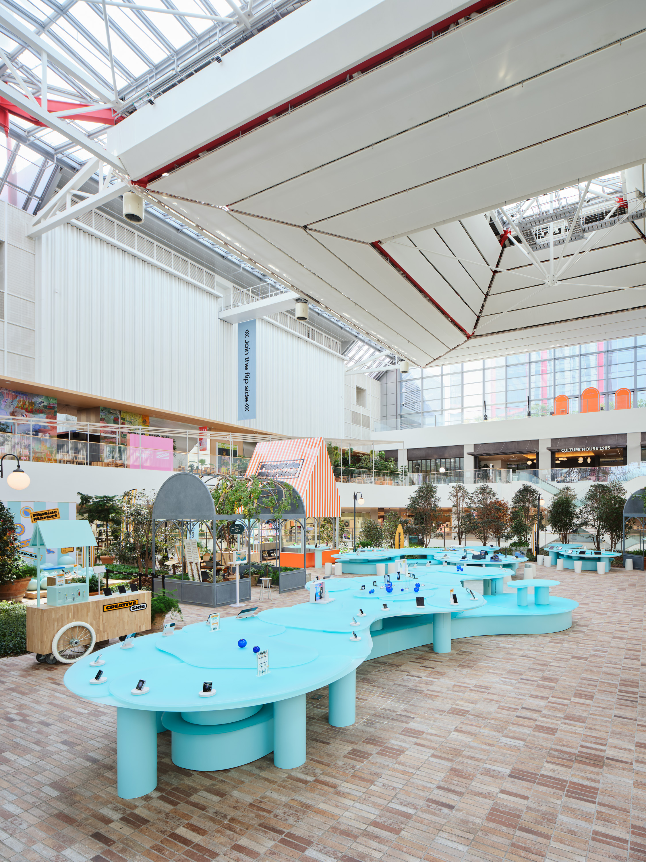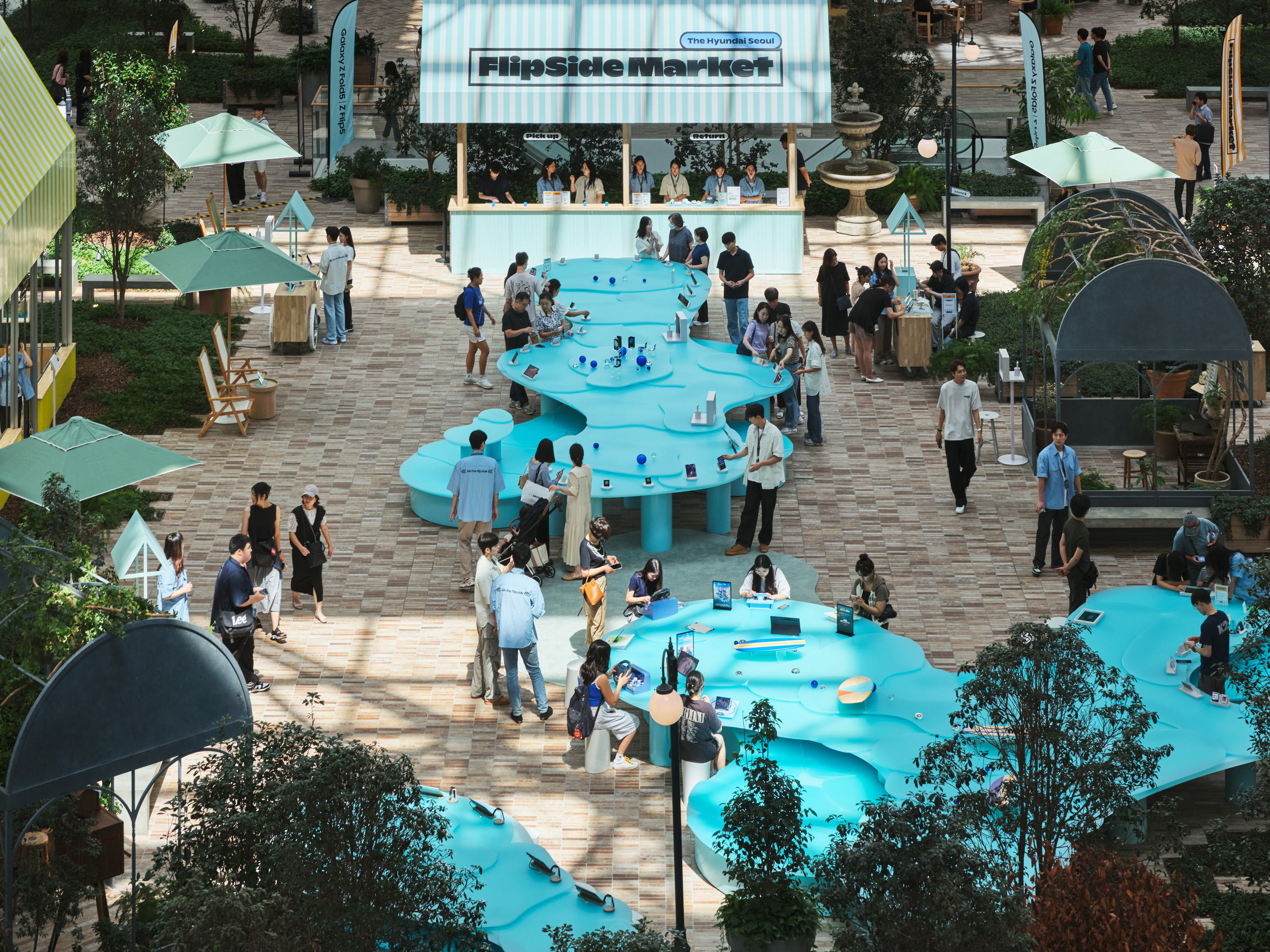 높이 솓아올라 있는 해변의 스트라이프 파라솔이 눈에 뛴다. 갤럭시 신제품의 다양한 색상을 활용하여 해변 마켓 파라솔의 스트라이프 패턴을 조합하였으며, 5개의 파고라로 구성된 철제 구조를 최대한 높게 설계하여 6층과 5층에서도 전체 공간에서 마켓을 인식할 수 있게 하였다. 내부는 집 형태로 디자인하여 체험 영역을 구성하였다. 유리 천장을 활용하여 자연적인 햇살을 최대한 활용하면서, 거대한 해변을 연상시키는 두 개의 테이블이 마치 여의도 한가운데 바다가 펼쳐져 있는 느낌을 줄 수 있도록 배치되었다. 이 테이블과 의자는 해변의 아름답게 일렁이는 물결을 상징하며, 반투명 아크릴 레이어를 겹쳐 사용하였다. 물결의 레이어가 햇빛을 받아 '워터 라이트' 효과를 연출해 더 실감나는 해변의 물결을 재현했다. 프로젝트 이후, 각각의 아크릴 테이블을 재활용하여 50개의 테이블로 만들어 필요한 곳에 계획되어 있으며, 팝업 컨셉의 맞는 디자인 요소도 놓치지 않으면서 지속 가능성 디자인에도 중점을 두었다.