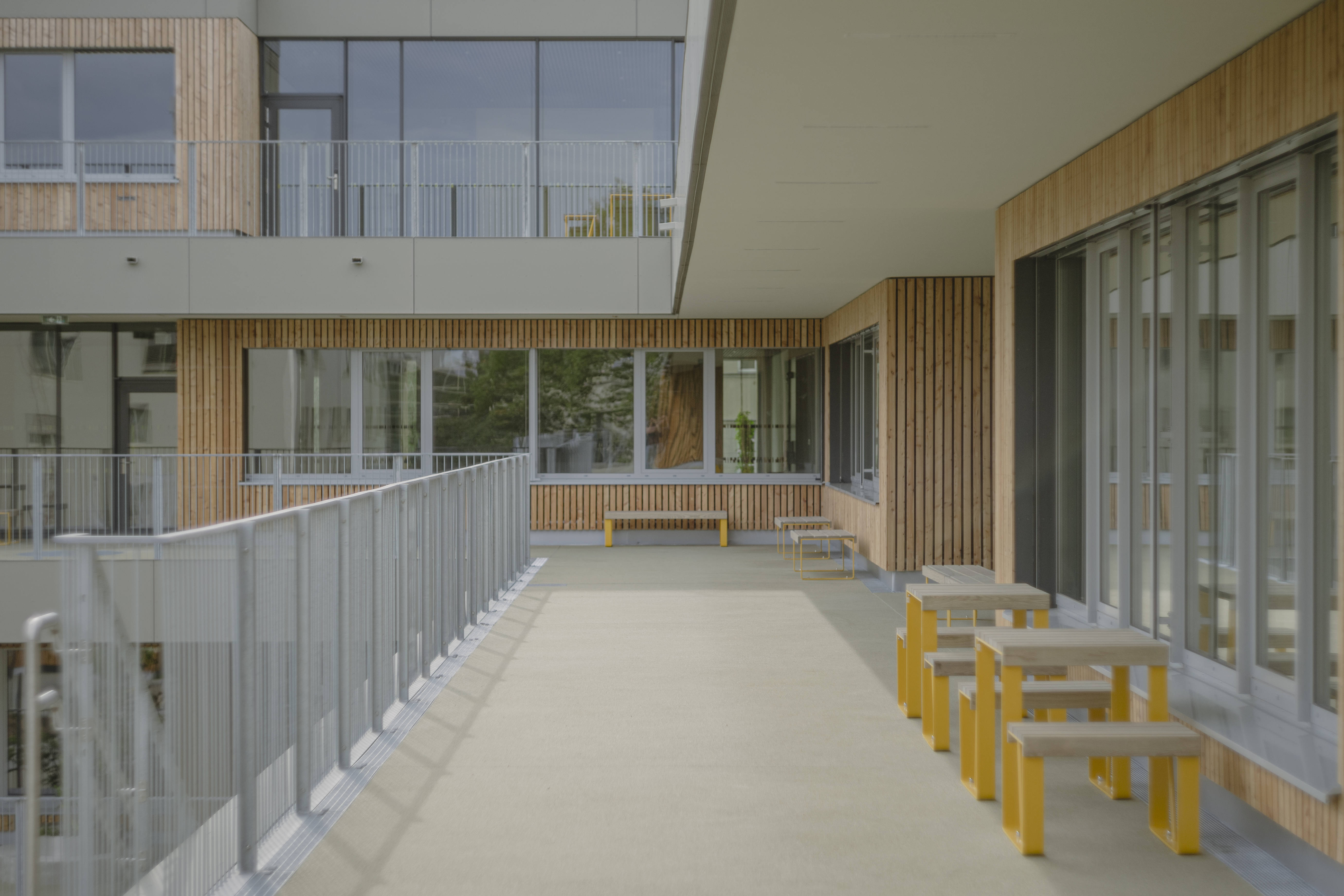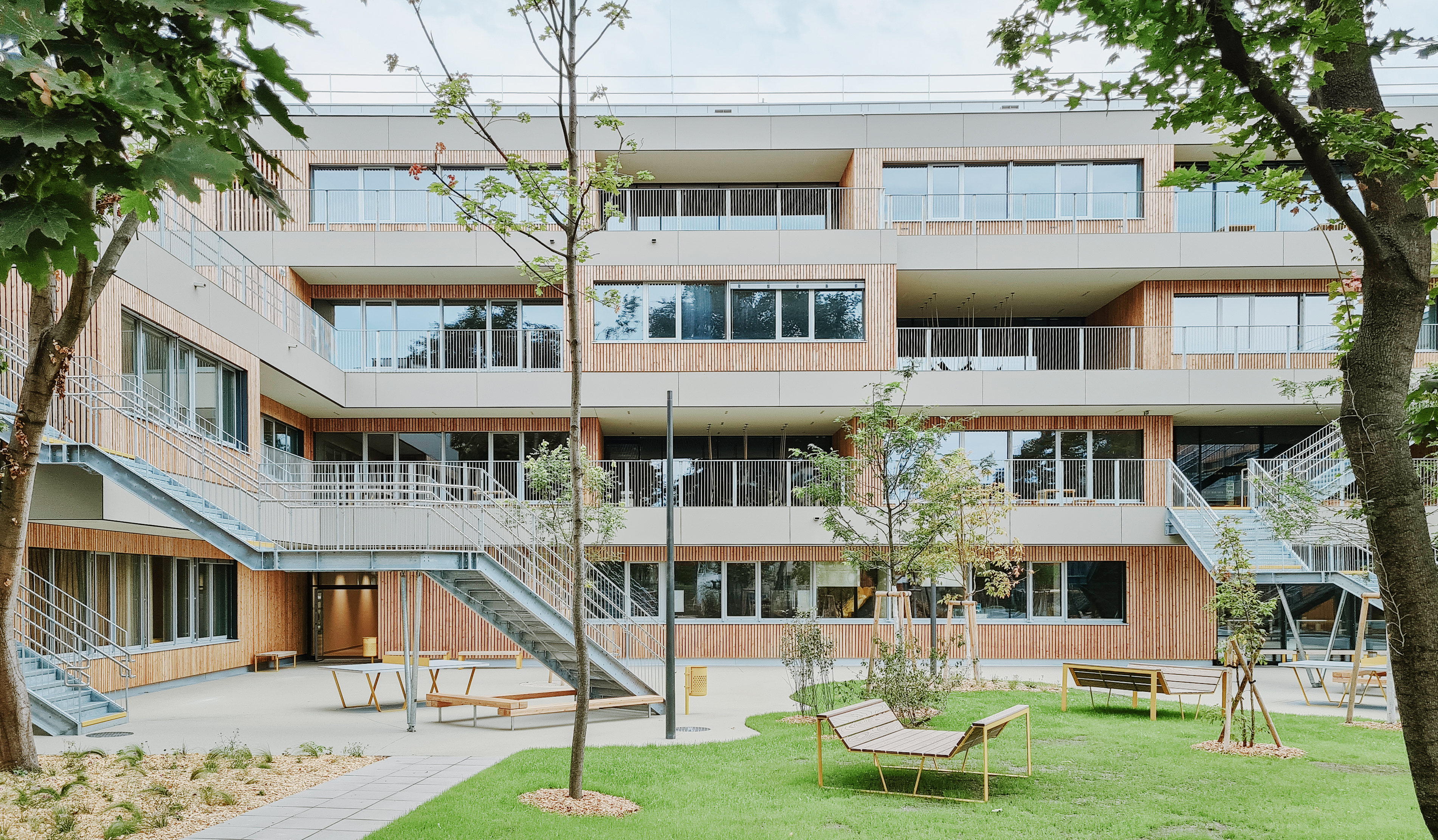 The thoughtful architecture extends to the outdoor area as well, where generous open spaces allow the children to play, learn and relax. Those areas are complemented by green terraces on the upper floors. Green façades not only improve the microclimate but also support Vienna’s "Urban Heat Island" strategy by helping to cool the surrounding environment.
