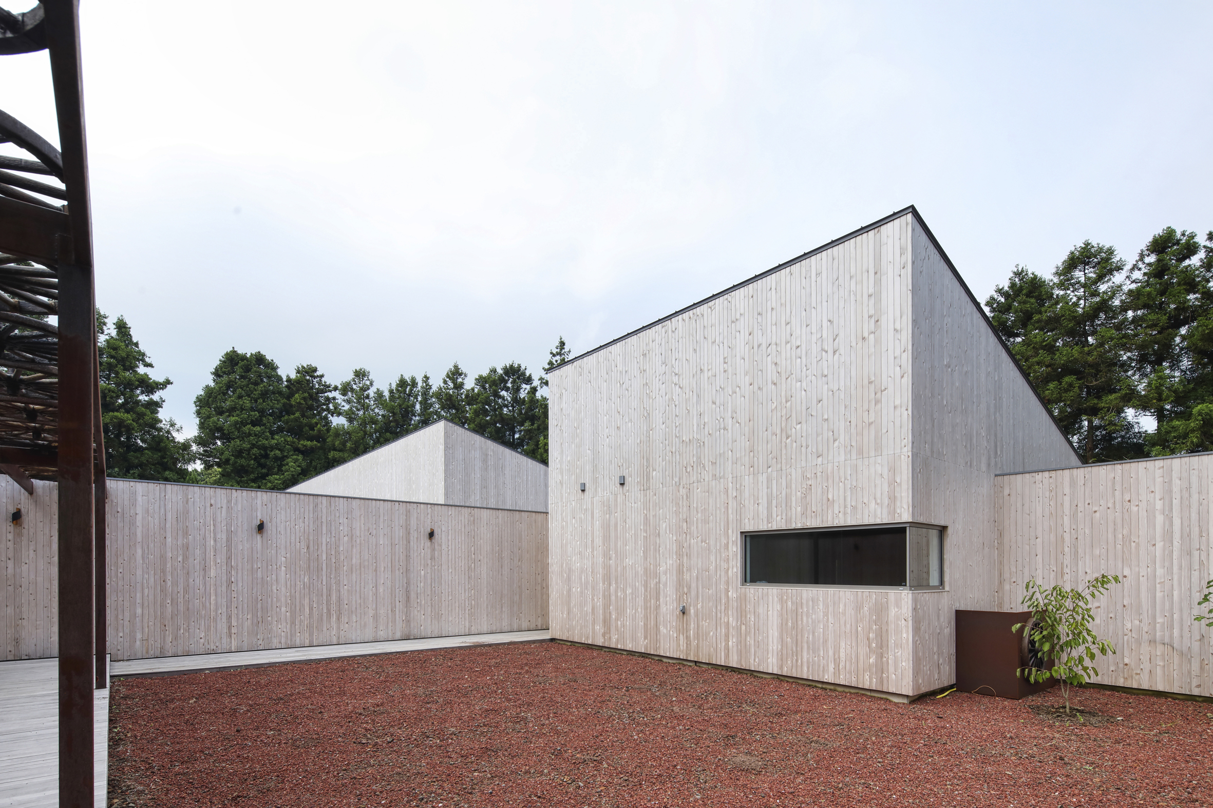 외부에서 인식되지 않는 이 장소는 숲 속의 또 다른 추상의 숲이며, 푸른 하늘과 붉은 송이석의 대비가 뚜렷한 비워진 공간이다. 중정의 안 벽은 규화 처리된 적삼목으로 마감되어 있는데, 수직으로 뻗은 삼나무 숲의 은유이며 하늘과 바닥을 자연으로 잇기 위한 시도였다.