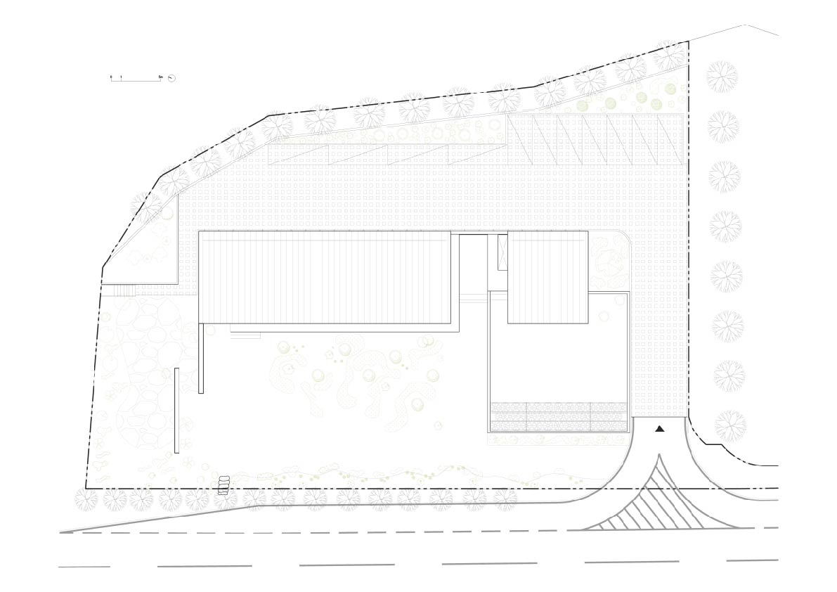 건물의 후면은 방문객을 위한 주차공간이며, 전면의 정원은 사진촬영을 위한 자연의 스튜디오 역할을 한다.