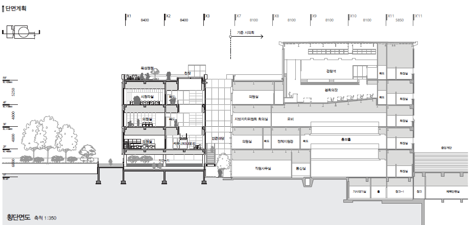 부족한 시의회 프로그램으로 의원실과 의회사무실, 그리고 주민 영역으로 구성되는 증축 영역에서, 독립된 증축 영역이 아닌 기존의 시의회의 건축을 존중하며 증축되는 새로운 영역을 통해 용인시청의 시의회 건물 전체가 하나의 새로운 공간으로서 더욱 효율적인 업무공간으로 거듭날 수 있는 의회 영역을 제안한다.