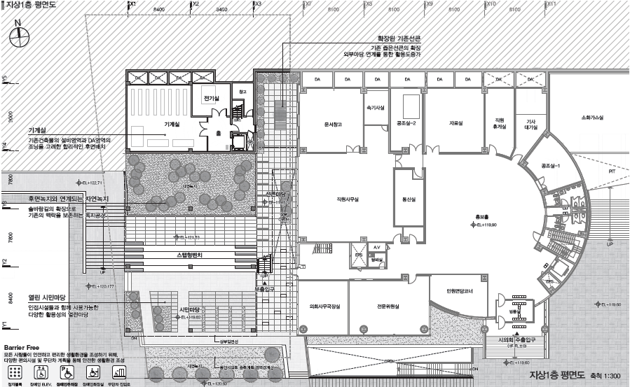 증축되는 공간은 용인시청 전면의 좌측 영역으로 기존의 녹지 영역에 위치한다. 예전 용인시청 건축계획의 콘셉트과 마스터플랜의 의도를 유지, 개선하는 것이 계획의 시작이다.