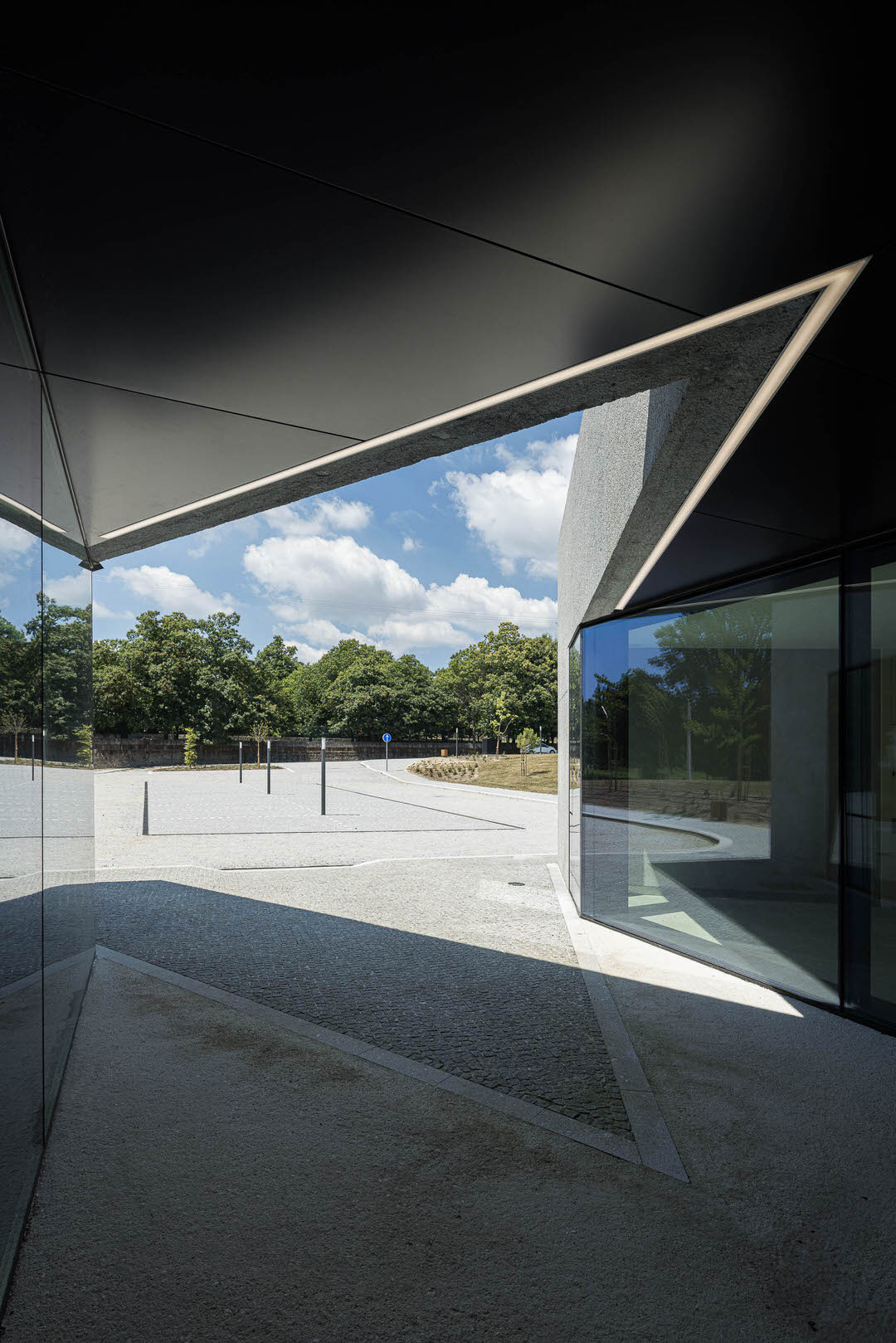 The external coverings/finishes are: walls in colored reinforced concrete with a deactivated and bush-hammered finish, blue; black anodized aluminum facade system for external openings; inverted roof finished in blue, colored draining concrete. The external coverings/finishes are: walls in colored reinforced concrete with a deactivated and bush-hammered finish, blue; black anodized aluminum facade system for external openings; inverted roof finished in blue, colored draining concrete.