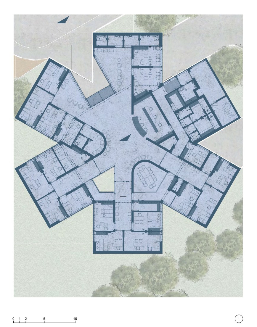 From a functional point of view, the building is divided into wings, which respect the formal structure of the “star”, subdividing and organizing the program into smaller spaces.