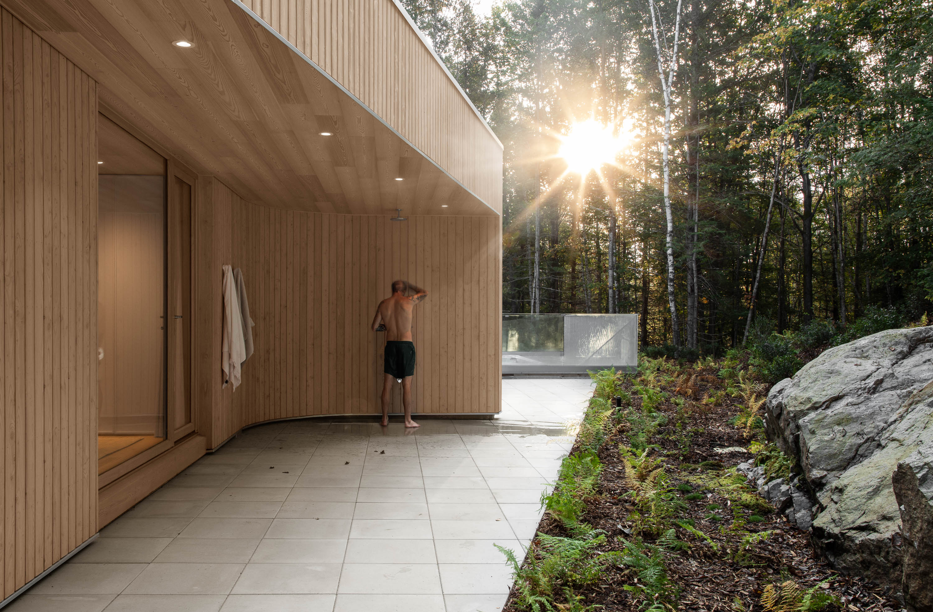 This interplay of materials creates a dynamic façade that resonates with the surrounding forest.