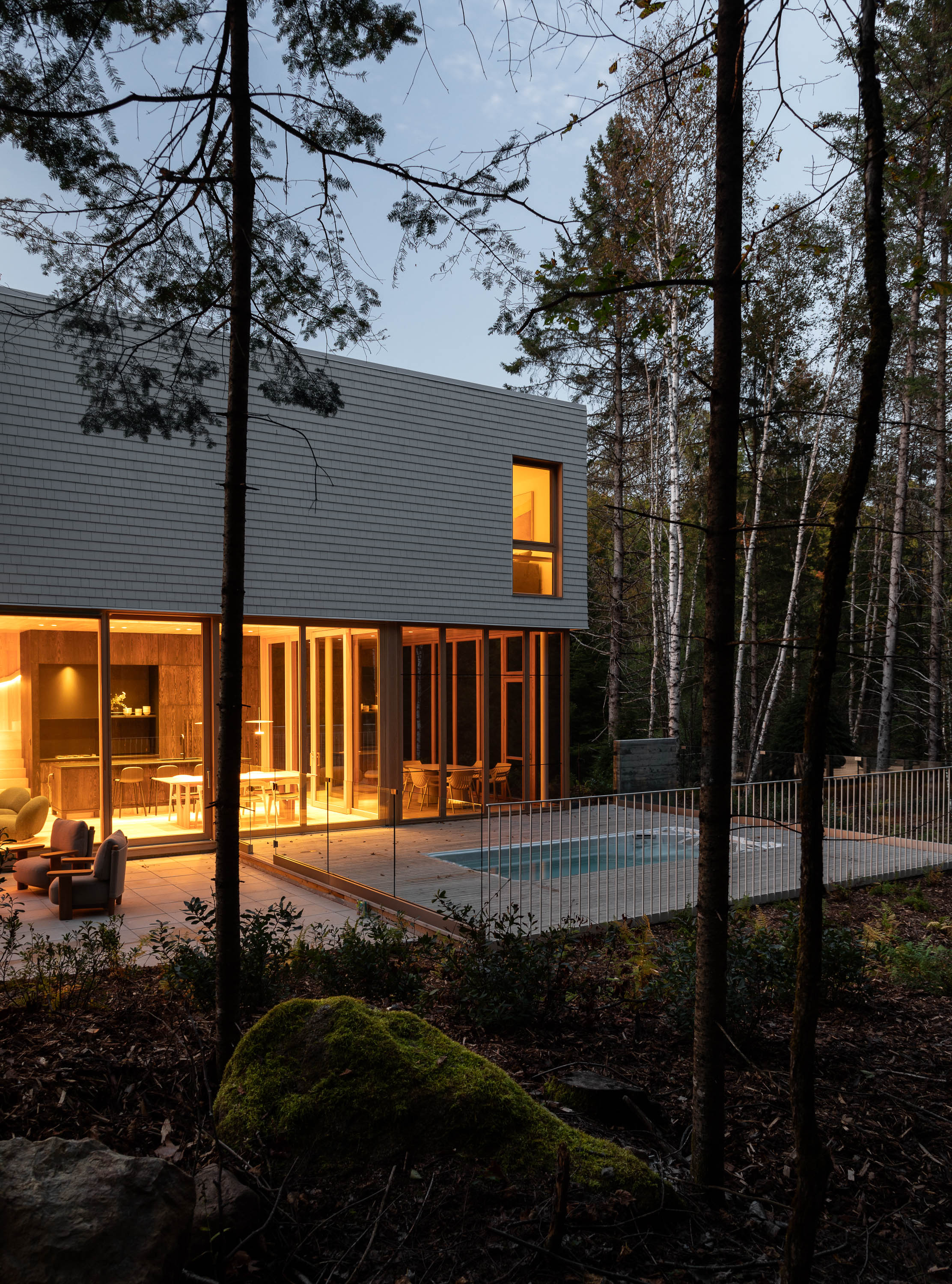 Nestled at the base of a hill within the Quartier 8 development of Mont Tremblant, Quebec, the Q8 Residence derives its name from its unique location. Embraced by a wooded landscape, this home seamlessly integrates contemporary architectural design with the tranquility of its natural surroundings. Approaching the residence, you encounter a closed façade with minimal openings, effectively turning its back to the road. The lack of windows on this side not only offers seclusion but also minimizes heat loss during the colder months, contributing to the home's energy efficiency.