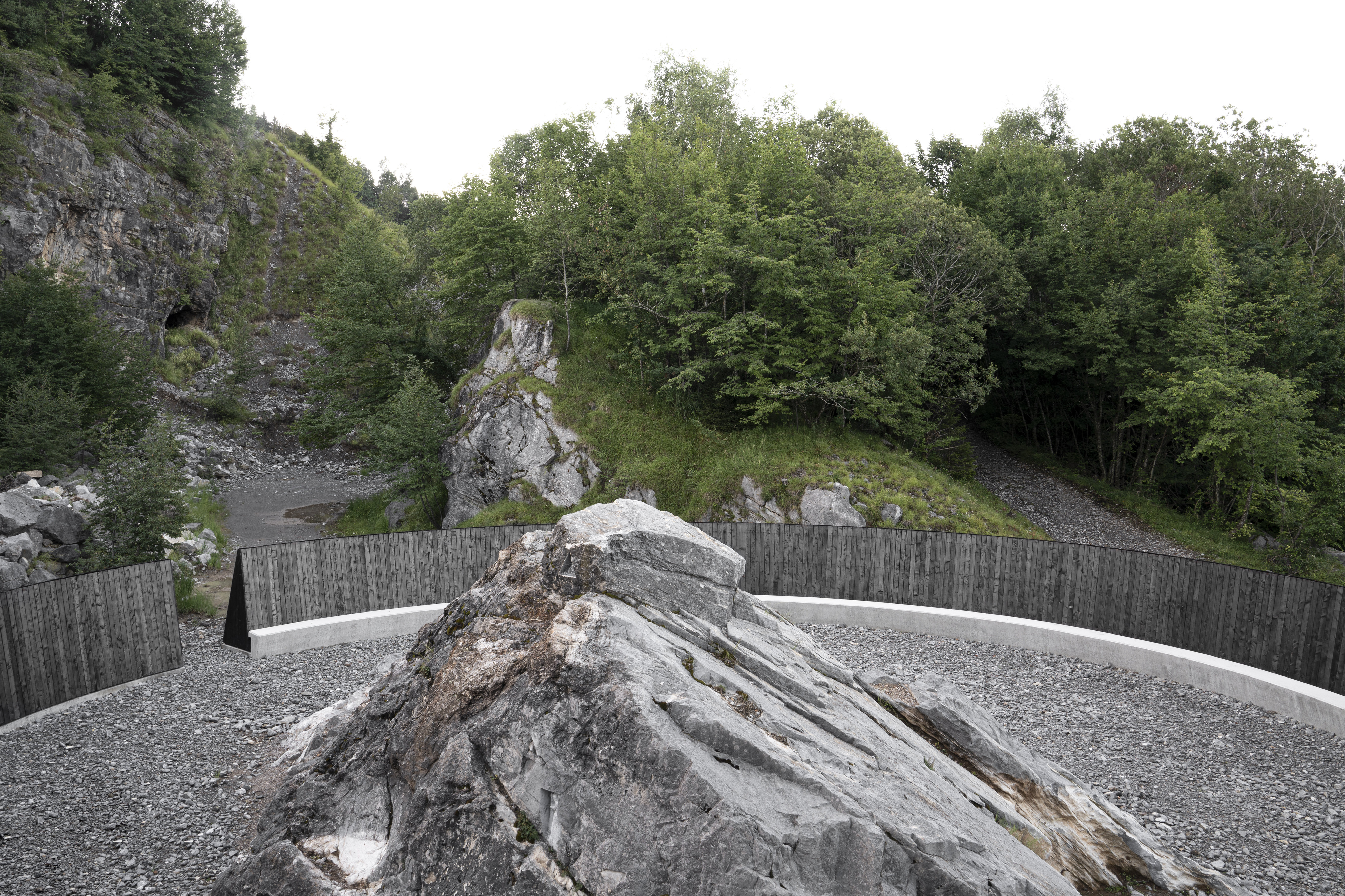 The monument ECHO OF THE MOUNTAIN celebrates the memory of all the people who worked in the now dismissed mining sites of Dossena. The project consists of a circular enclosure, reminiscent of local wooden fences, embracing a large stone, sculpted by the artist Francesco Paterlini, and isolating it from the surrounding landscape, giving it a symbolic and contemplative nature.