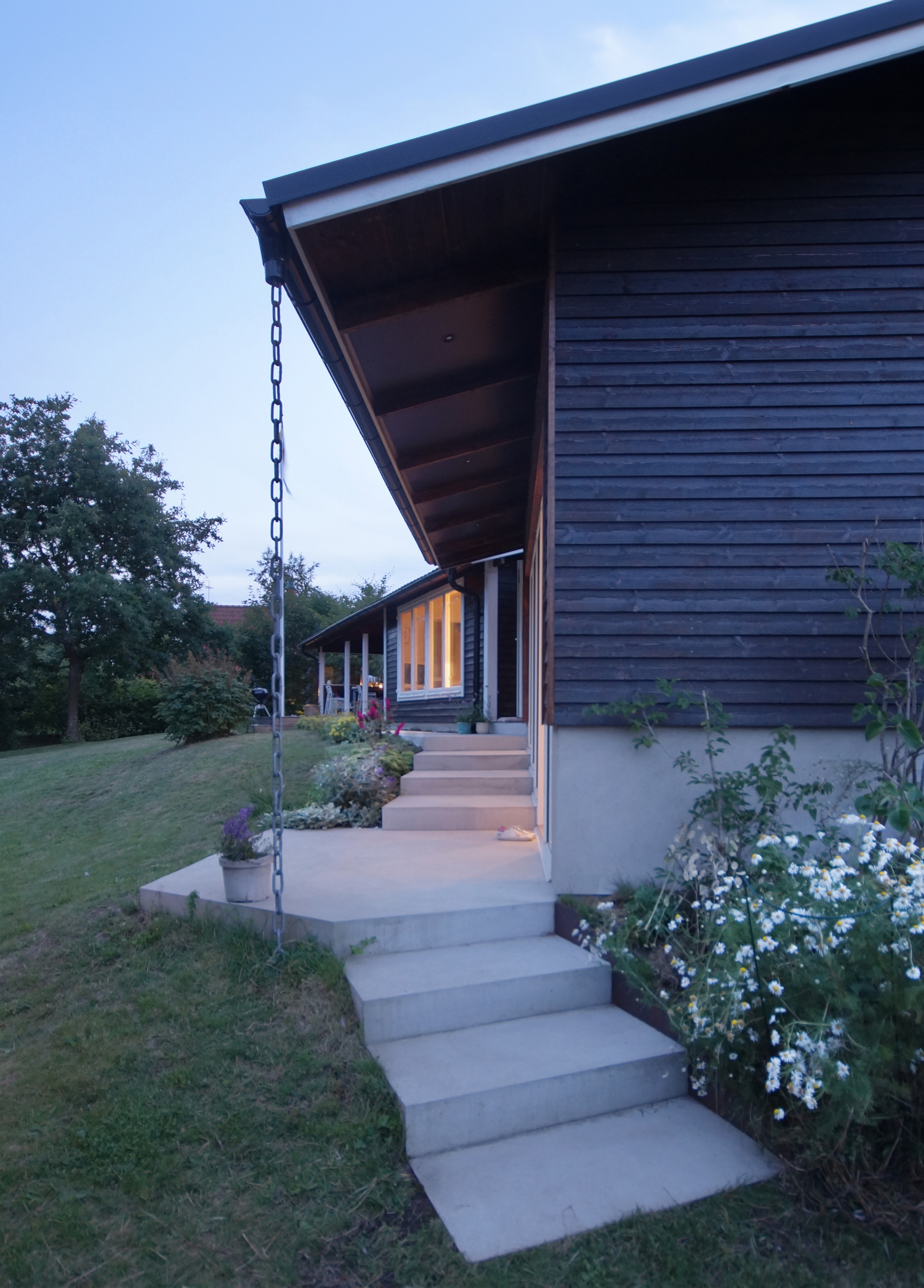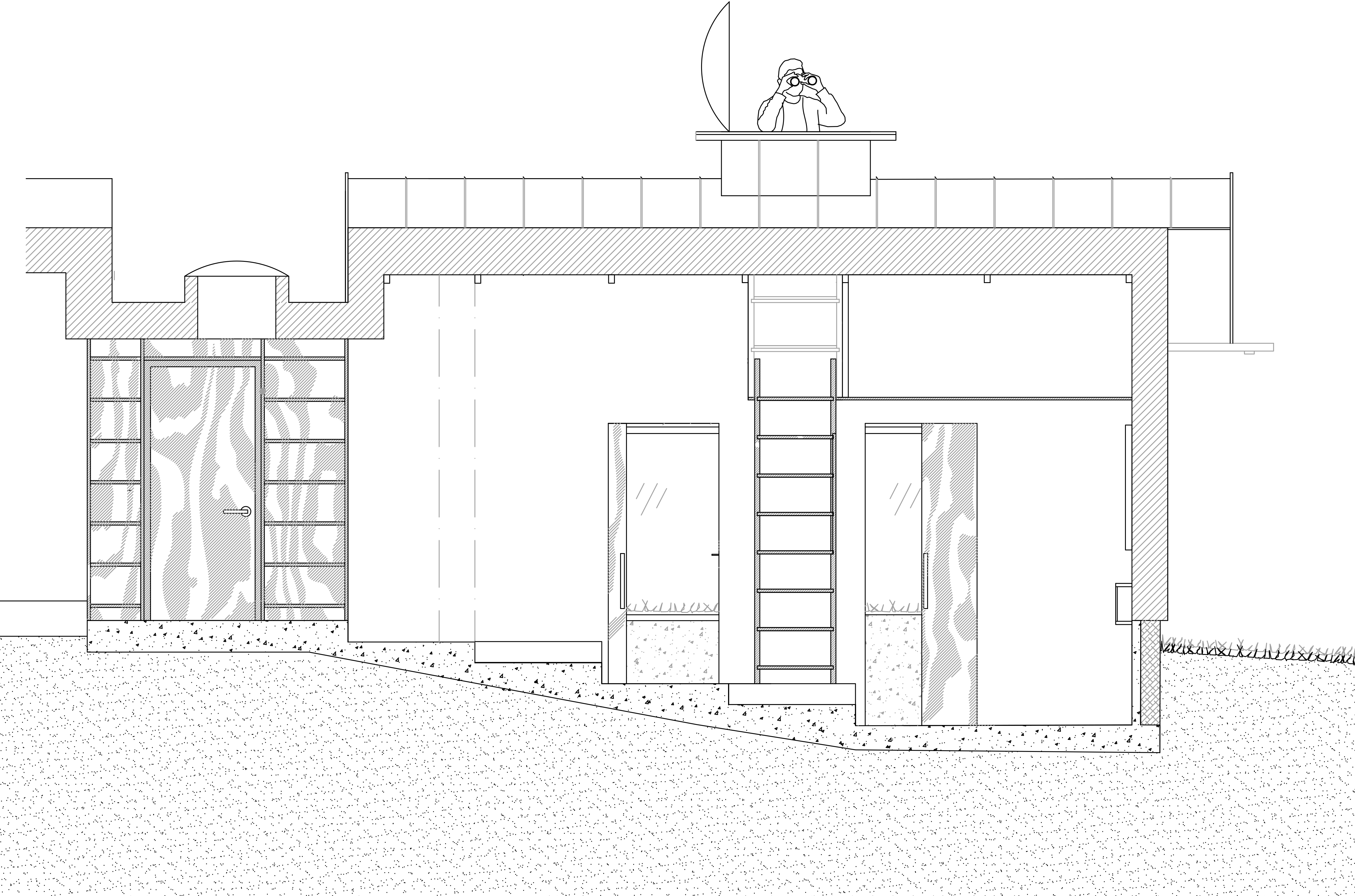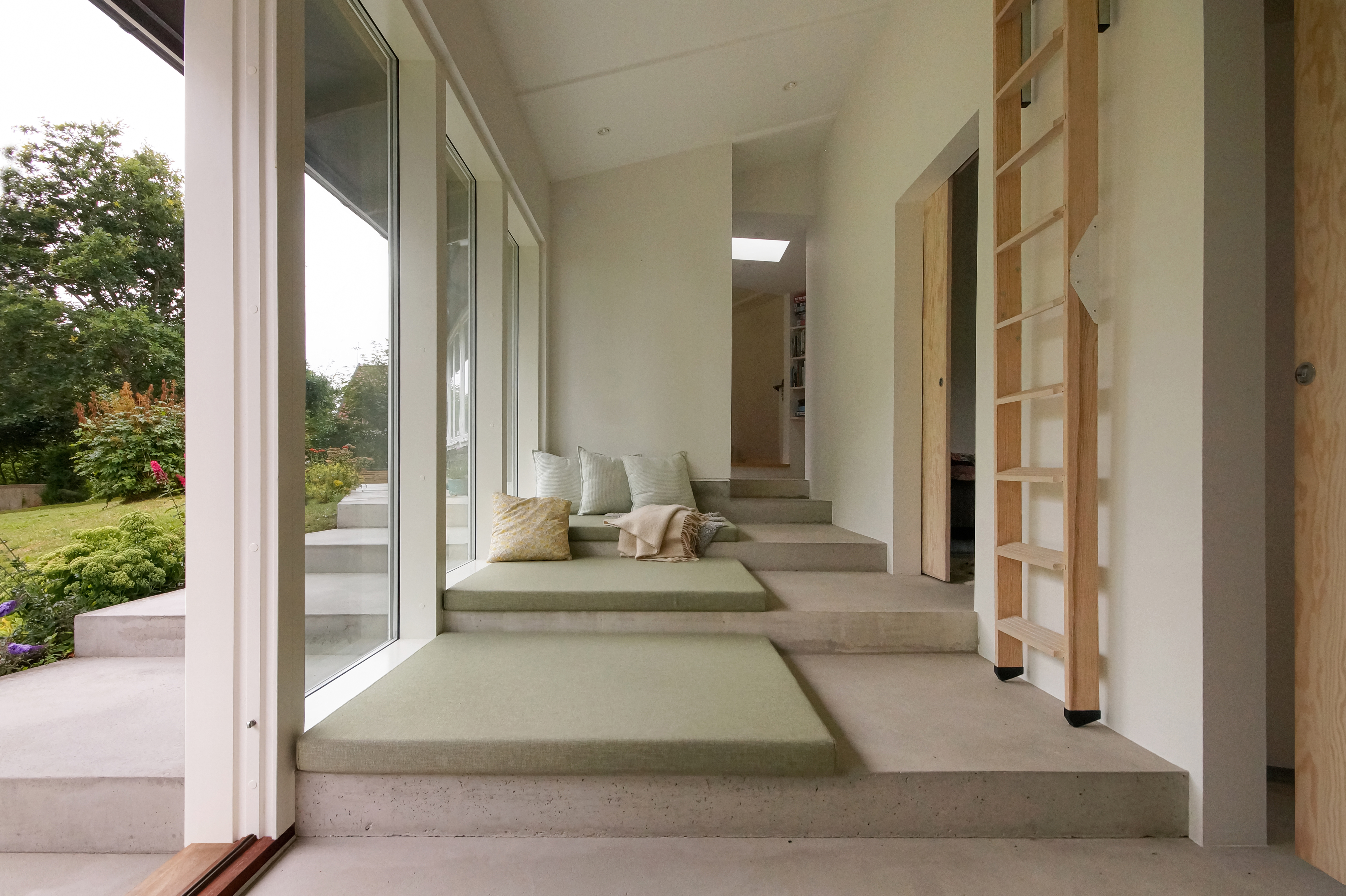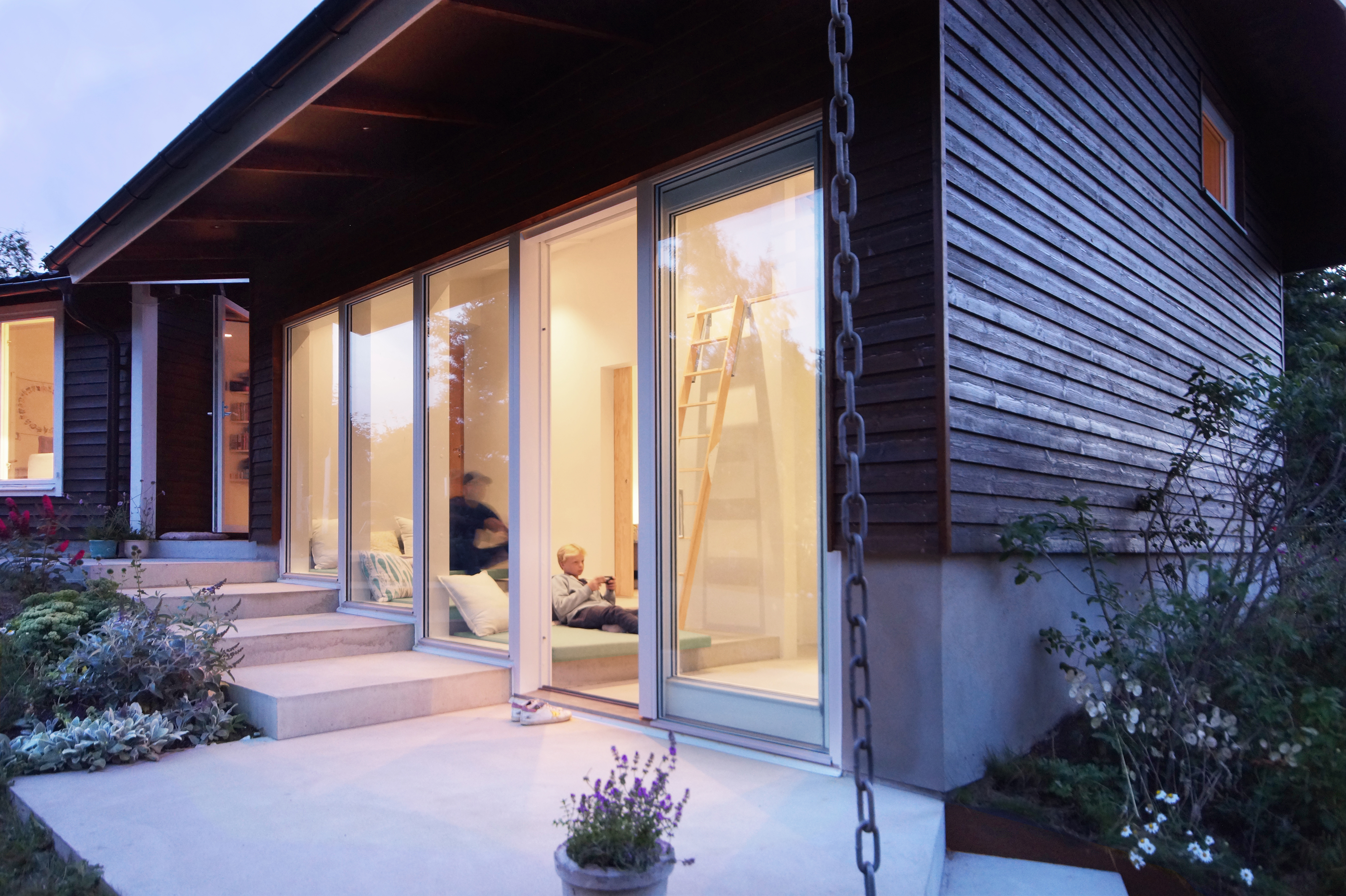 The house follows the slope on the garden side and lets the concrete garden stair continue into the house. On this side the continuation of the stair becomes a social amphitheater with big glasses connecting it to the garden. The garden stair is also the entrance to the main building and is covered by a cantilevering roof protecting the stairs but also creating a sense of common space with the inside. The backside of the house is carved into a hill where two bedrooms are located. The concrete foundation becomes a concrete wall where the floor level is below ground. All windows are placed on top of the concrete foundation. The shifts in heights create different relations between the openings and its surroundings. In the bedrooms below ground you get the meadow at eye level offering a close looked at flowers and insects right outside the window.