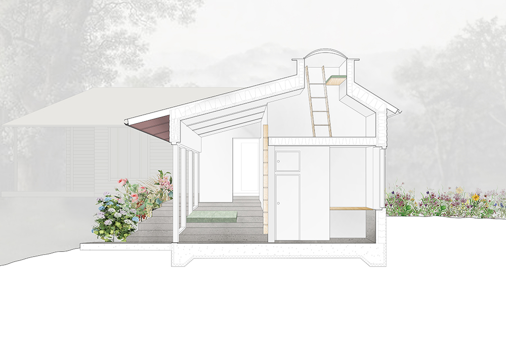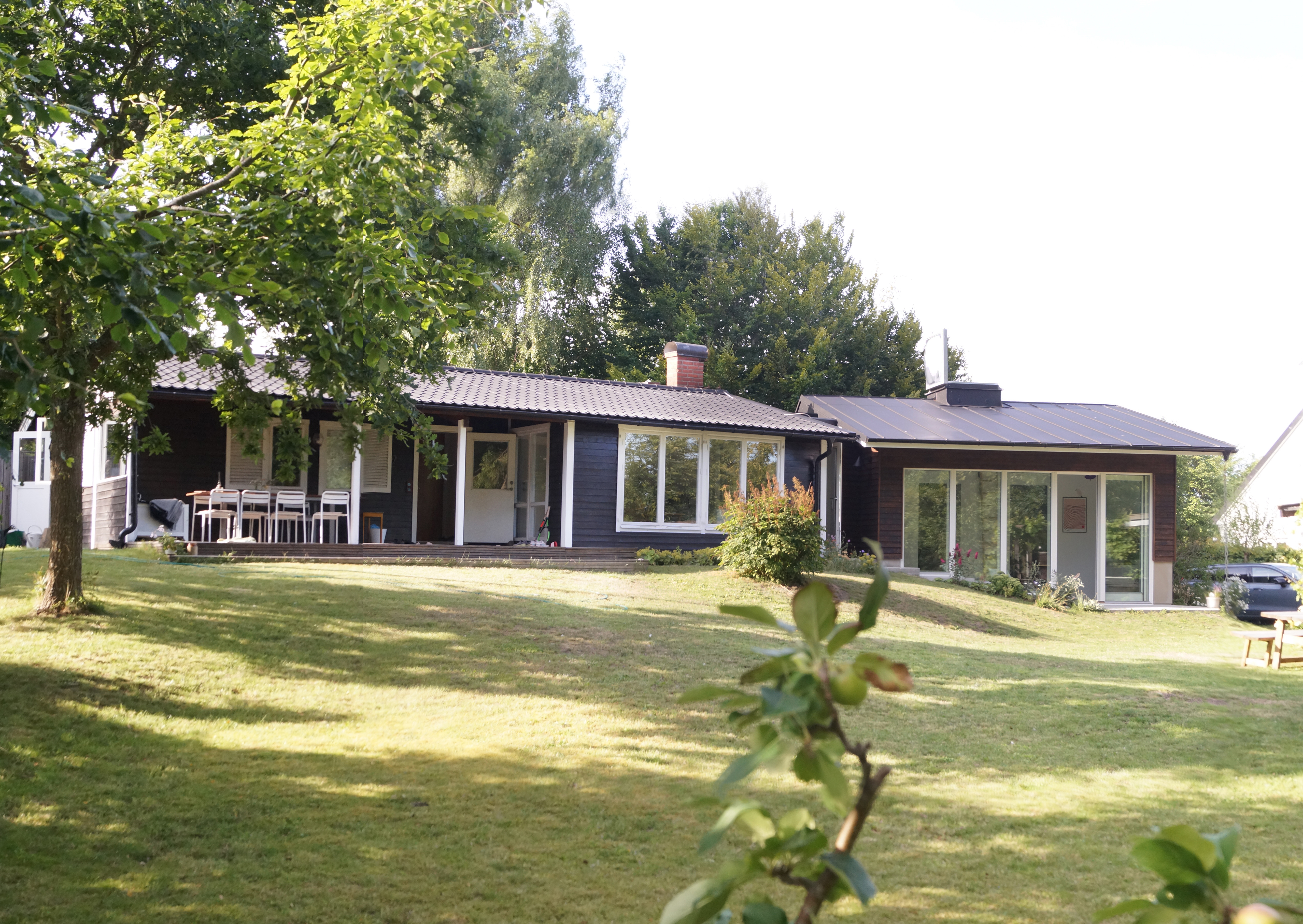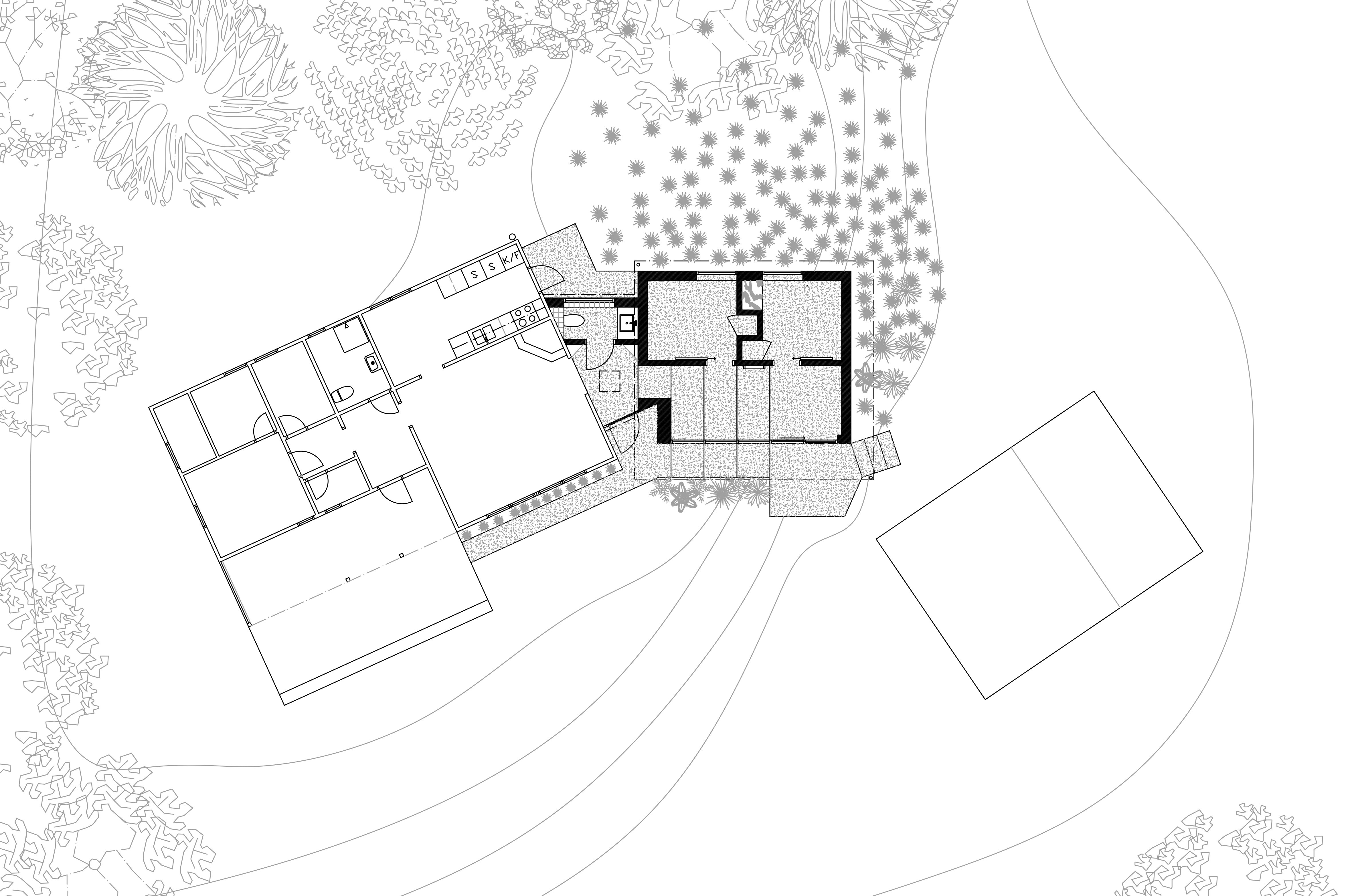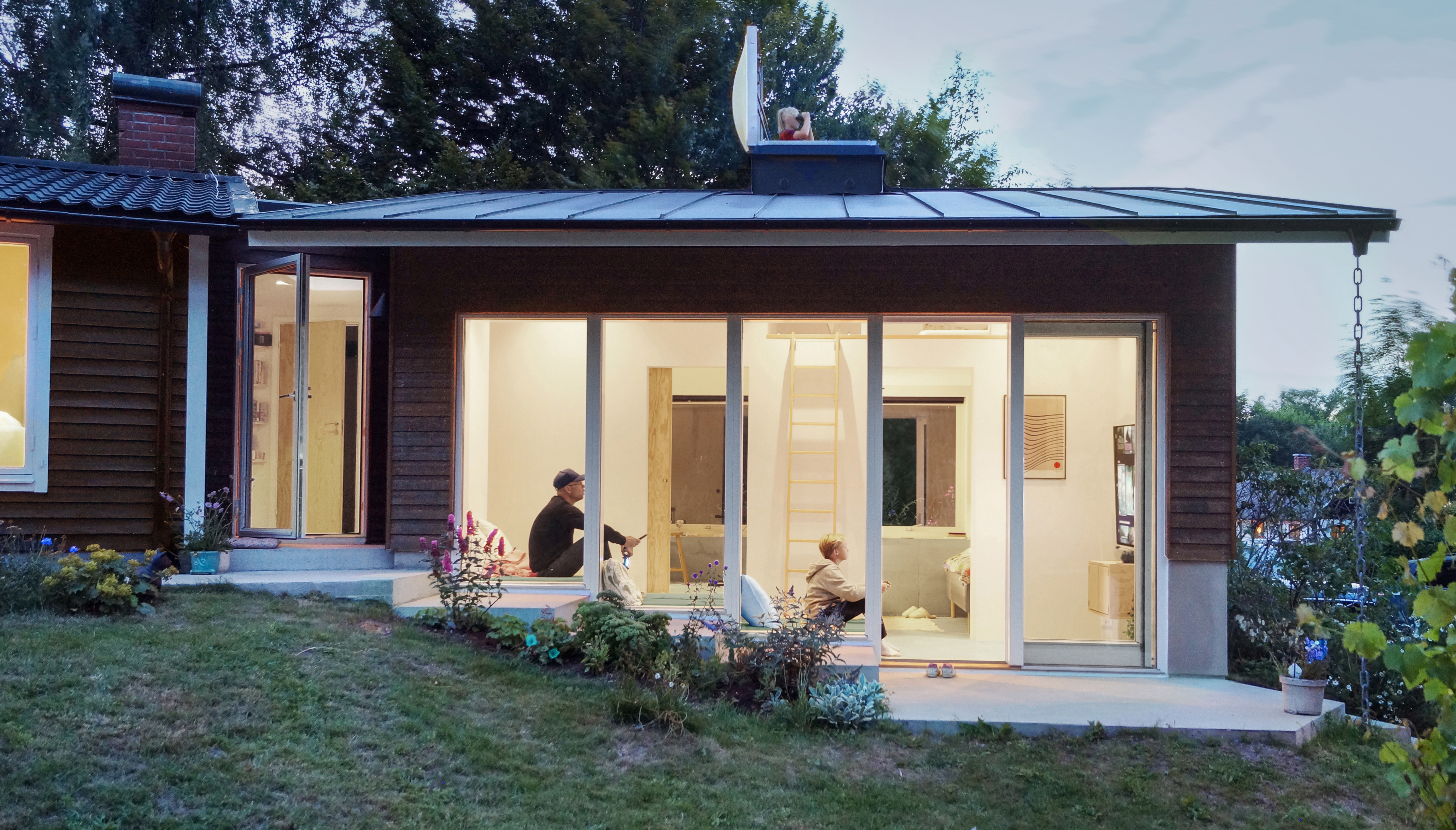 The house follows the slope on the garden side and lets the concrete garden stair continue into the house. On this side the continuation of the stair becomes a social amphitheater with big glasses connecting it to the garden. The garden stair is also the entrance to the main building and is covered by a cantilevering roof protecting the stairs but also creating a sense of common space with the inside. The backside of the house is carved into a hill where two bedrooms are located. The concrete foundation becomes a concrete wall where the floor level is below ground. All windows are placed on top of the concrete foundation. The shifts in heights create different relations between the openings and its surroundings. In the bedrooms below ground you get the meadow at eye level offering a close looked at flowers and insects right outside the window.