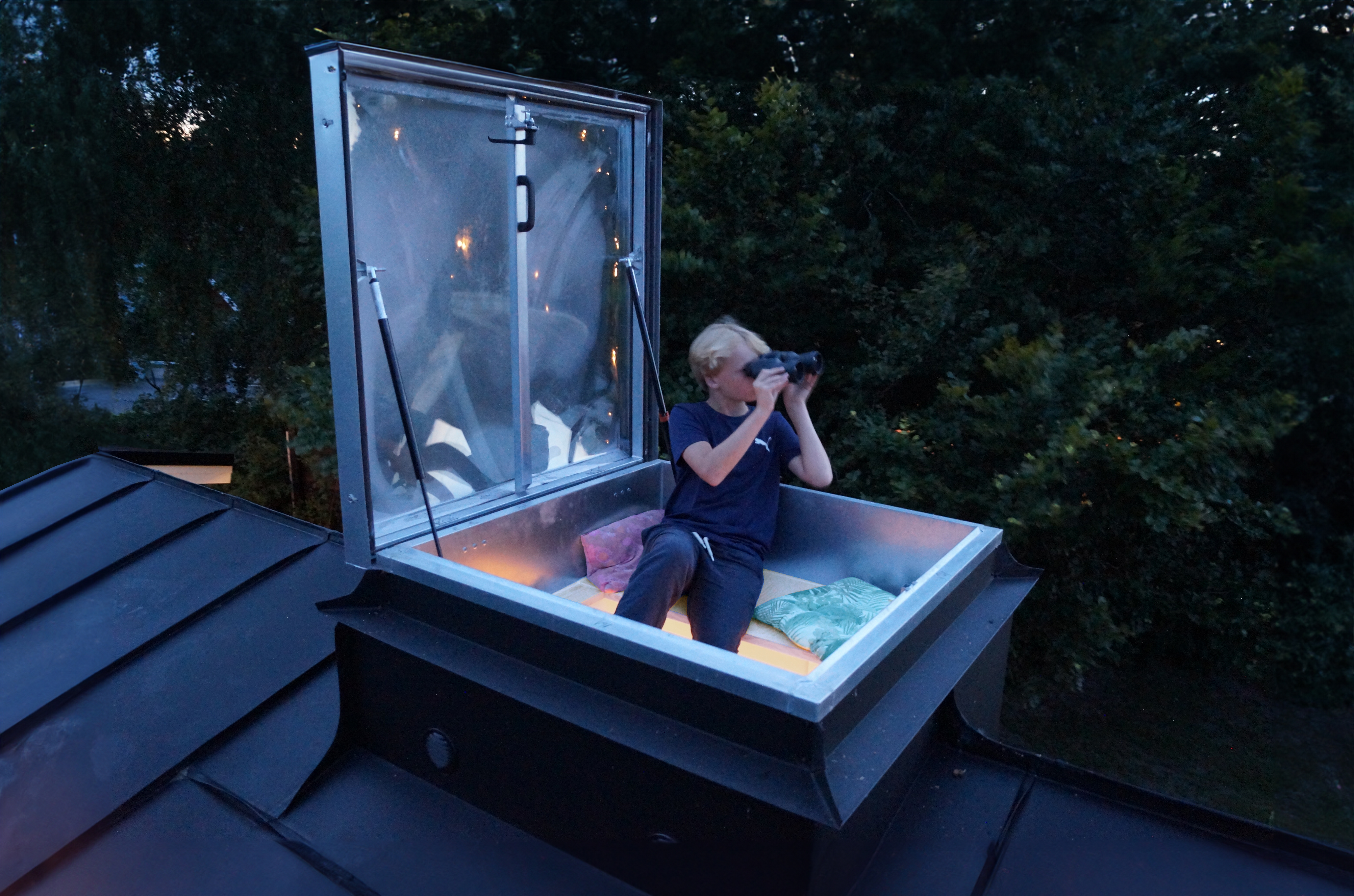 The social room is connected to a loft. From the loft you reach a viewing platform underneath an openable skylight from where two people can sit and get an ocean view.