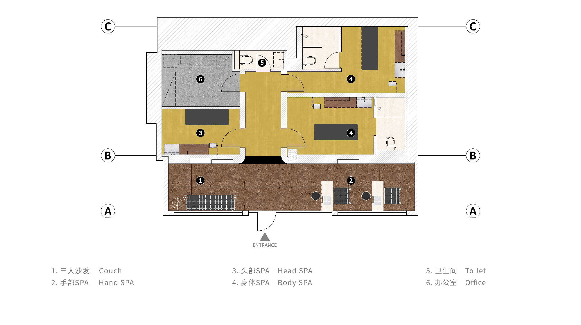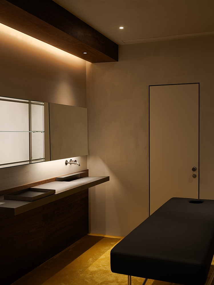 The SPA space is in the backyard, and the small courtyard between the two buildings acts as a buffer zone, making the SPA area quieter and more independent. The space is on the first floor of an old foreign-style house, with the steel window structure of the external facade retained and refurbished. The interior has been modified to make the best use of the limited available space. The hand SPA area and the sofa waiting area are outside. The entire white wall creates a more transparent and bright appearance. The hand SPA area features a disguised faucet to maintaina similar tone with the main space. The single SPA room adopts a warm grey micro-cement wall, creating a more peaceful and relaxing feeling than the outside. It cleverly blends the storage function into one wall, freeing up extra space. The floor is covered with yellow shag carpet, which matches the brand color. From soft to hard furnishings, we enhance the sense of comfort and warmth by focusing on the user's feelings.