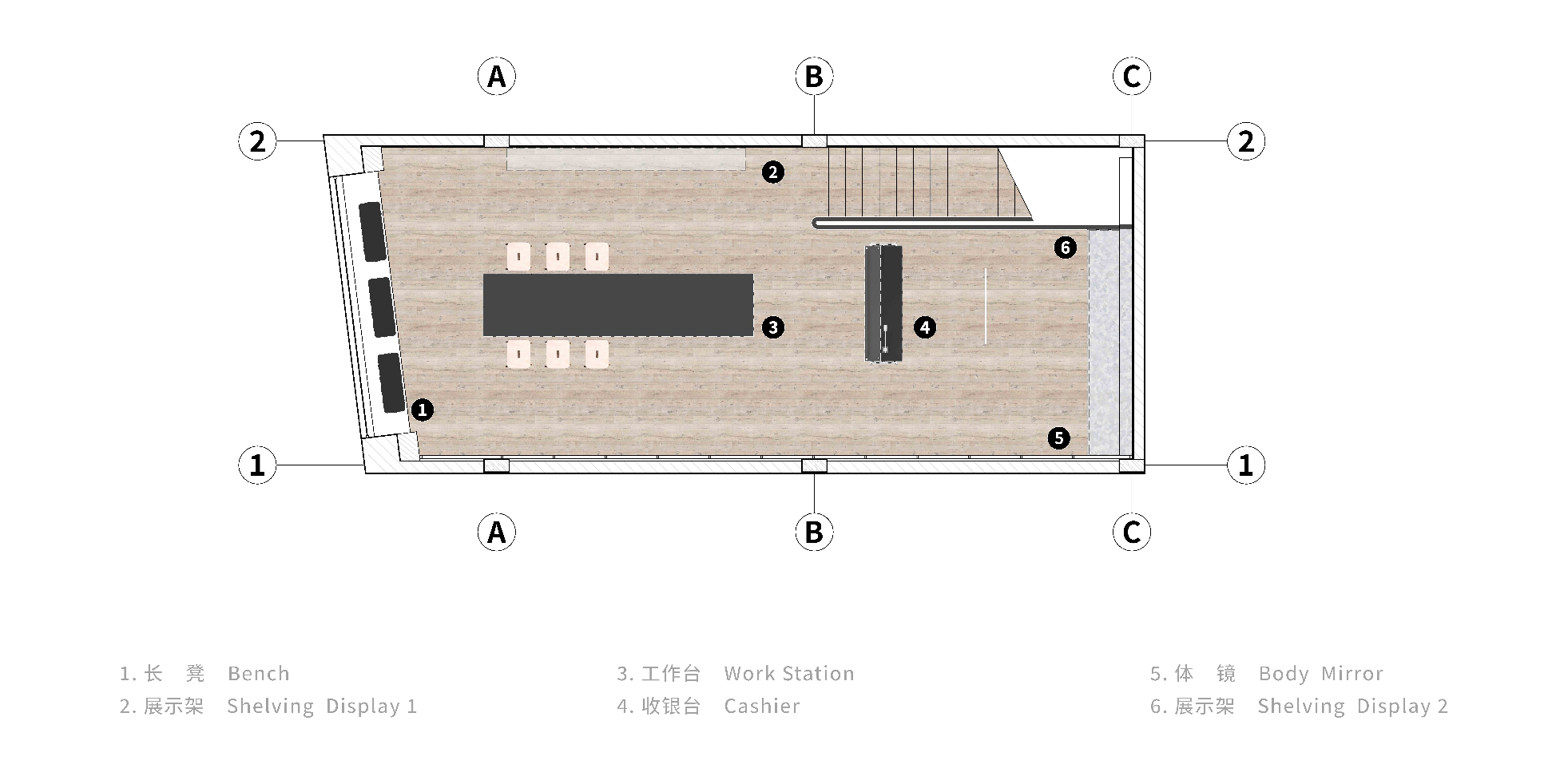 In addition to fulfilling the cashier role, the second-floor space provides capacity for future branding initiatives. Two walls are used, with one showing brand brochures and posters and the other displaying the brand's exclusive "body mirror". The original building's pitched roof structure was left uncovered, and the yellow color representing the brand was blended into the web steel structure of the wall. The surface is covered with body mirrors and galvanized sheets. This is a projection of the general spatial concept, which removes all extraneous decorations.The structure is regarded as the meridians and collaterals of the space, carrying its functional flow.