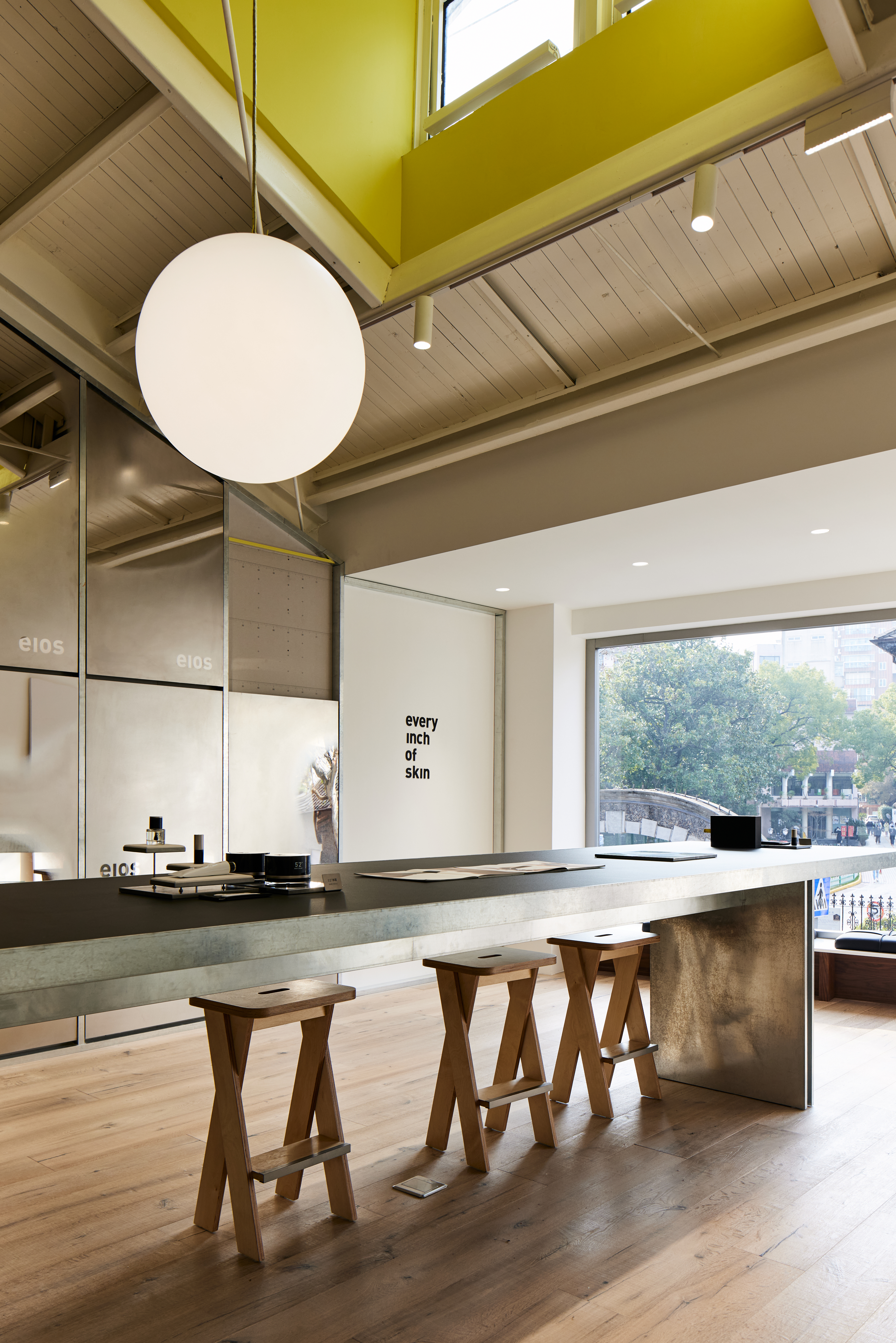In the center of the space, a large island display table is paired with wooden stools. It can be used as a venue for future brand activities. The yellow tape measure above serves as a chandelier line, echoing the elements of the first store. The floor-to-ceiling glass windows at the end of the building bring the street view outside into the space. The landscape varies with the flow of the seasons and becomes a natural decoration in the space. Sitting on the stool and taking in the natural scenery, people, space, and nature are all interwoven, sparking a deeper resonance.