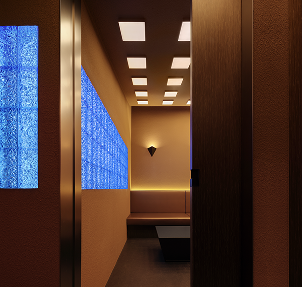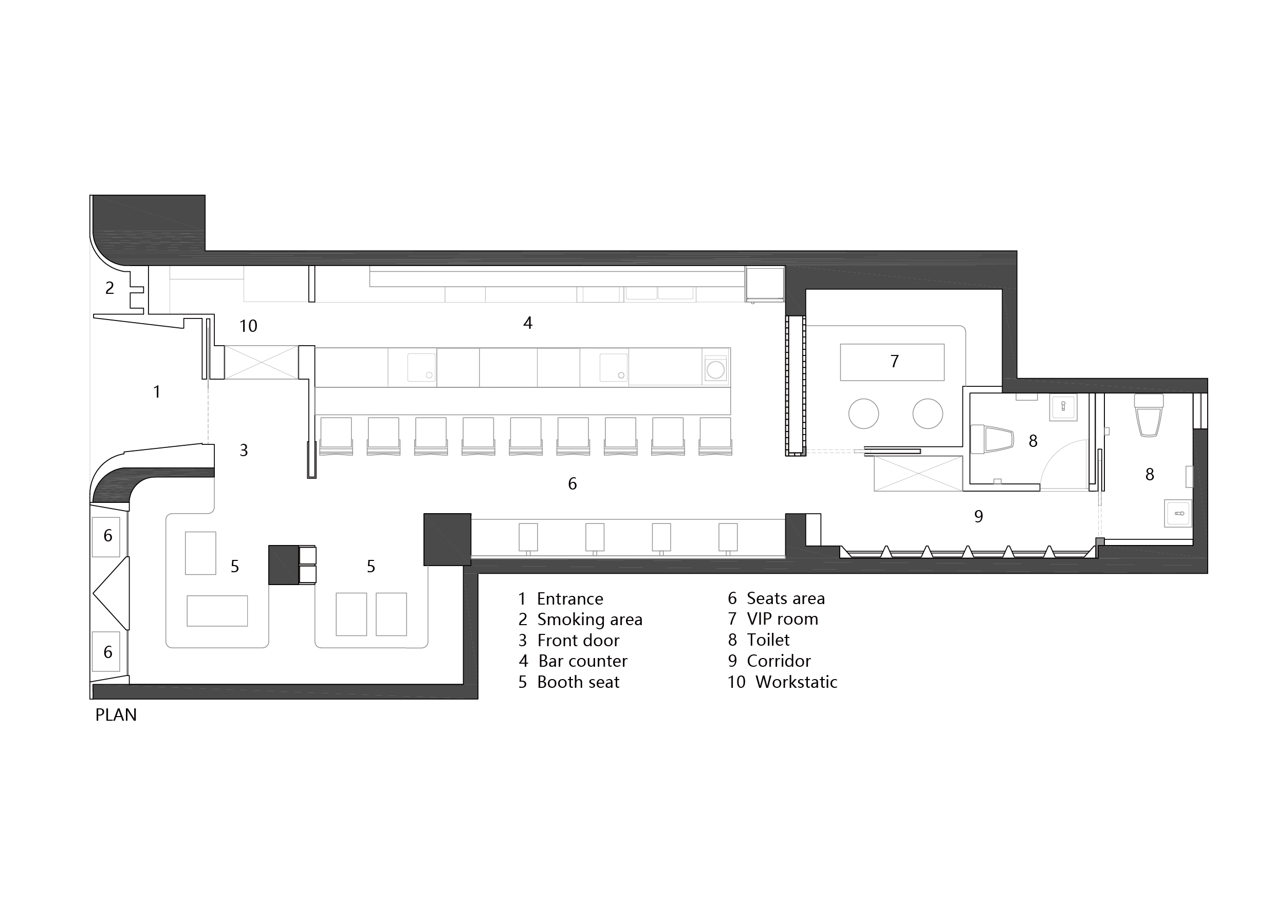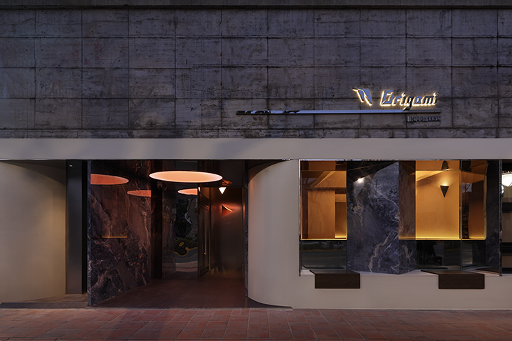 We have reduced the size of the main entrance and added a section of partition wall to eliminate the yellow metal panels from visually interfering with the entrance area. The area to the left of the partition wall was planned as a smoking area, while the right side served as the entrance to the bar. By reducing the scale of the entrance, the area is made more private and attractive. Above the entrance, an orange breathing circular soft film light with a constant on mode is designed to attract pedestrians to stop and provide a warm visual sensation for them at night. The glass window area on the right side of the facade is subdivided into two parts, with seating for pedestrians to stop for a short time, while customers can enjoy the relaxing outdoor atmosphere with a glass of wine, reinforcing the coherence of the indoor/outdoor space and the overall interactivity of the environment.