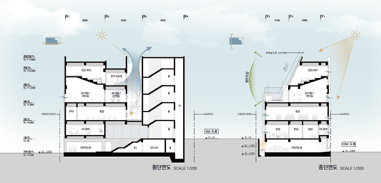 경사지형에 접한 대지의 특성을 활용하여 다양한 레벨에서 진입이 용이하도록 출입공간을 계획하였다.