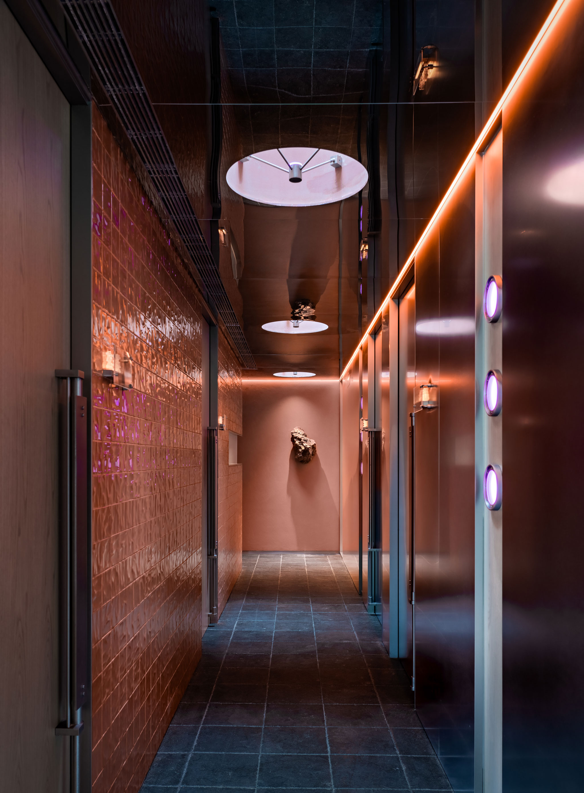 The non-open area is divided into four VIP rooms. Looking up from below, the corridor roof opens with circular skylights, reminiscent of the moment a space capsule leaves Earth, casting mechanical cold light.