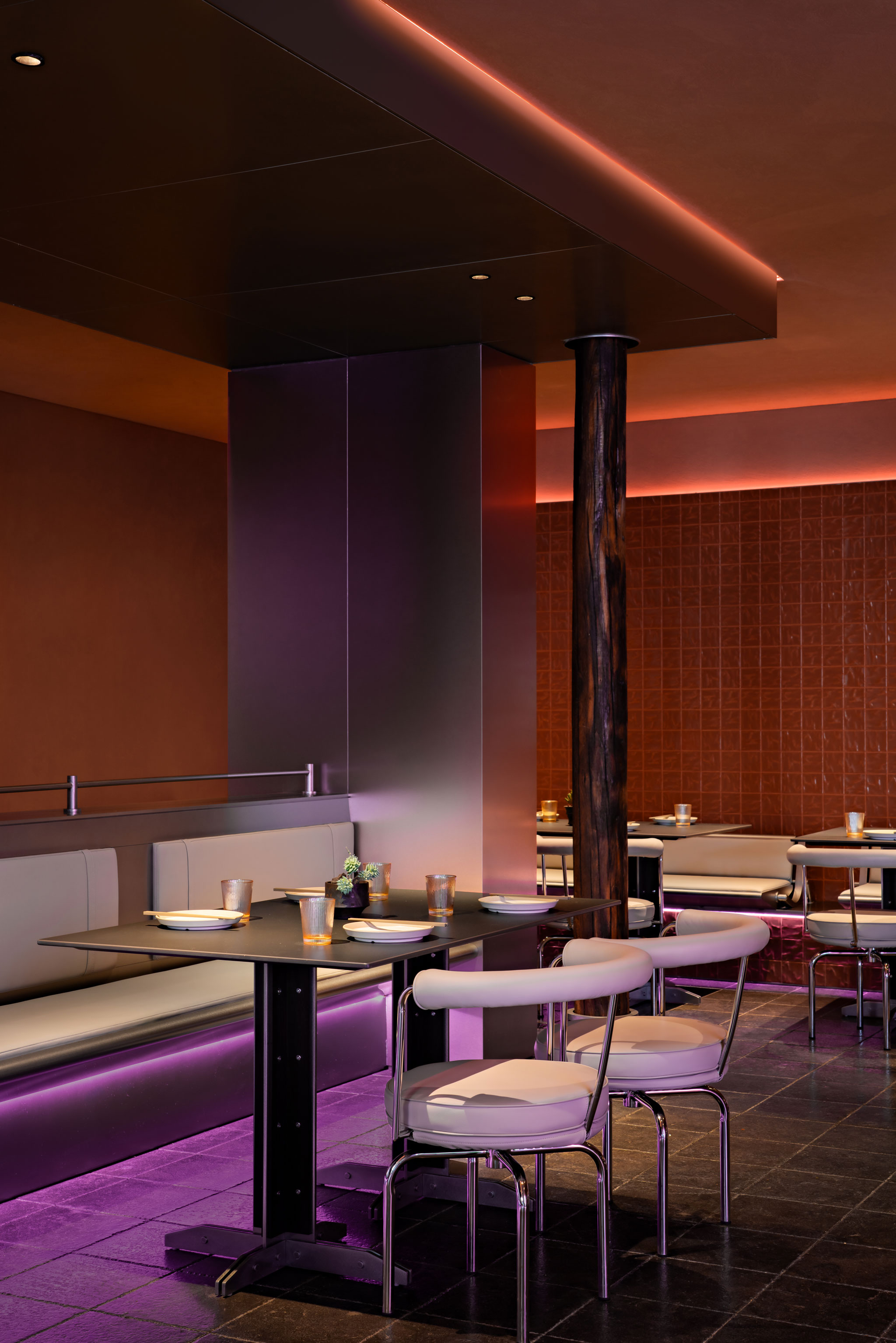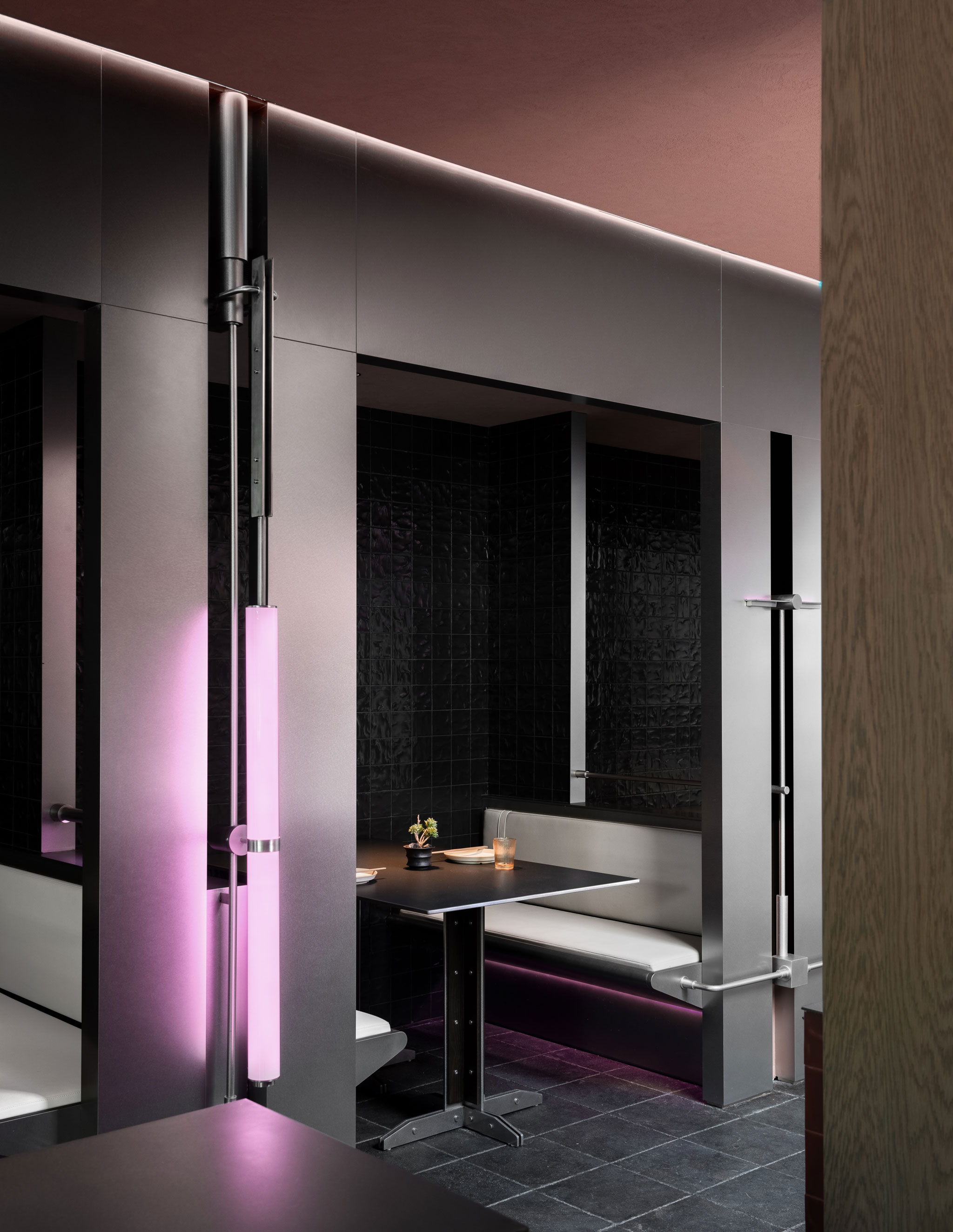The designer uses bold colors and cold metal materials to envelop the space in a retro-futuristic glow. The atmosphere is partially derived from futurism and partially from modernism represented by machinery. The design seeks clues from nearly a century of aesthetic language while breaking free from specific stylistic paradigms. Cleanliness and abstraction are imparted to metal components, combined with classical fantasy lighting, creating a retro-mechanical feel that glides towards a futuristic cosmos. The relaxed dinner time becomes a shared "hallucination" of visual and gustatory sensations.