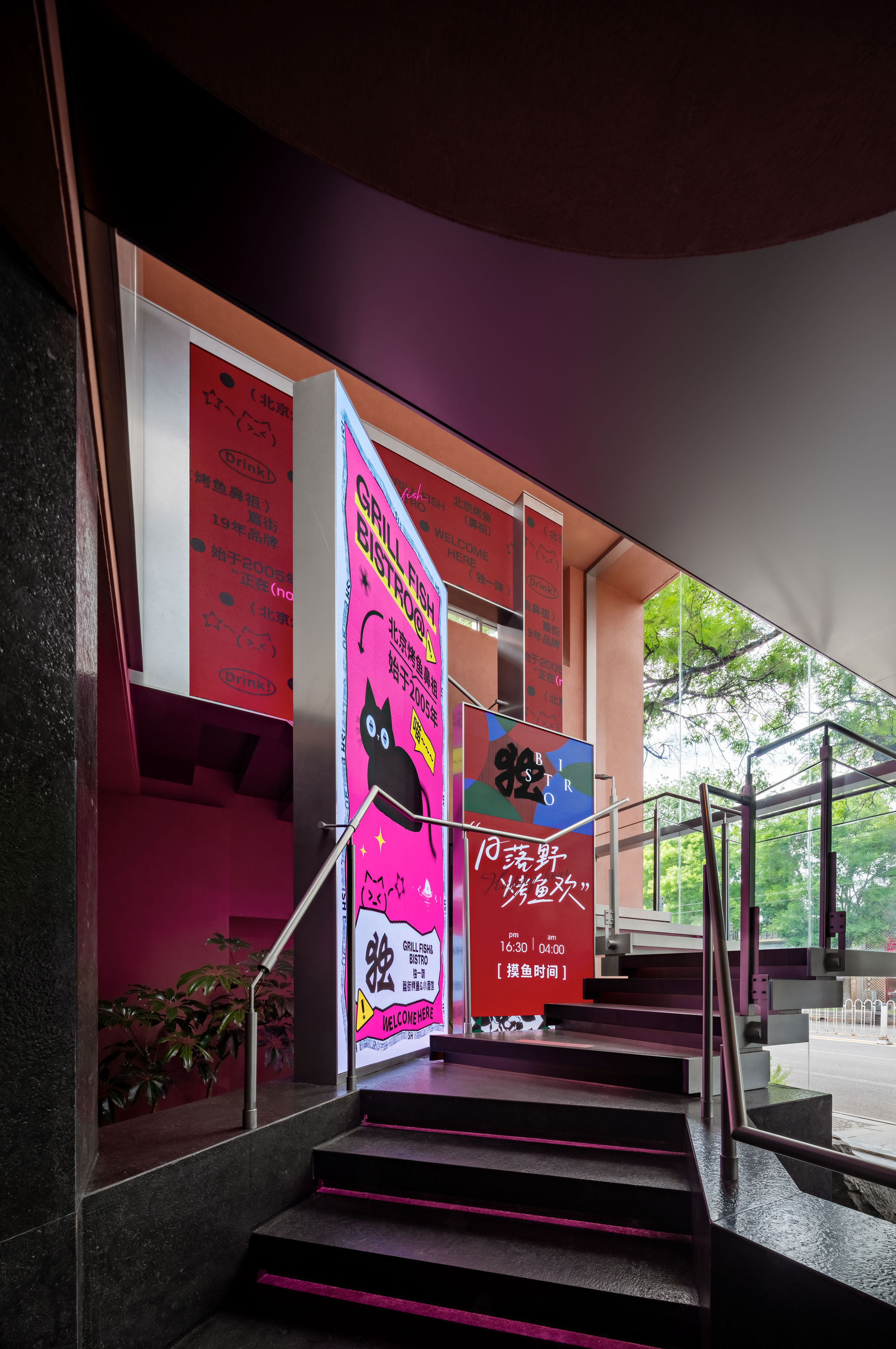 The black cat that occasionally appears in lightboxes and space corners is the "Night Owl" IP designed by the designer for the restaurant. Every sunset, the ancestor of Beijing grilled fish takes over the leisure time of young people: gentle and surging, free and slightly tipsy.