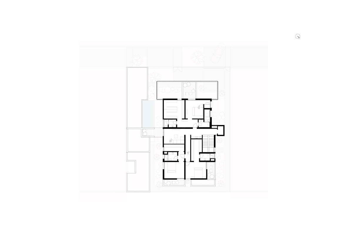 The villa's travertine plinth extends outward, carving interstitial spaces that offer varying degrees of privacy depending on their location. Public spaces, such as the living and dining areas, open directly onto the pool, while private spaces benefit from their own secluded open nooks, ensuring intimacy and seclusion. These strategically placed interstitial spaces balance communal openness and personal retreat, contributing to a holistic design that maximizes functionality and spatial efficiency.