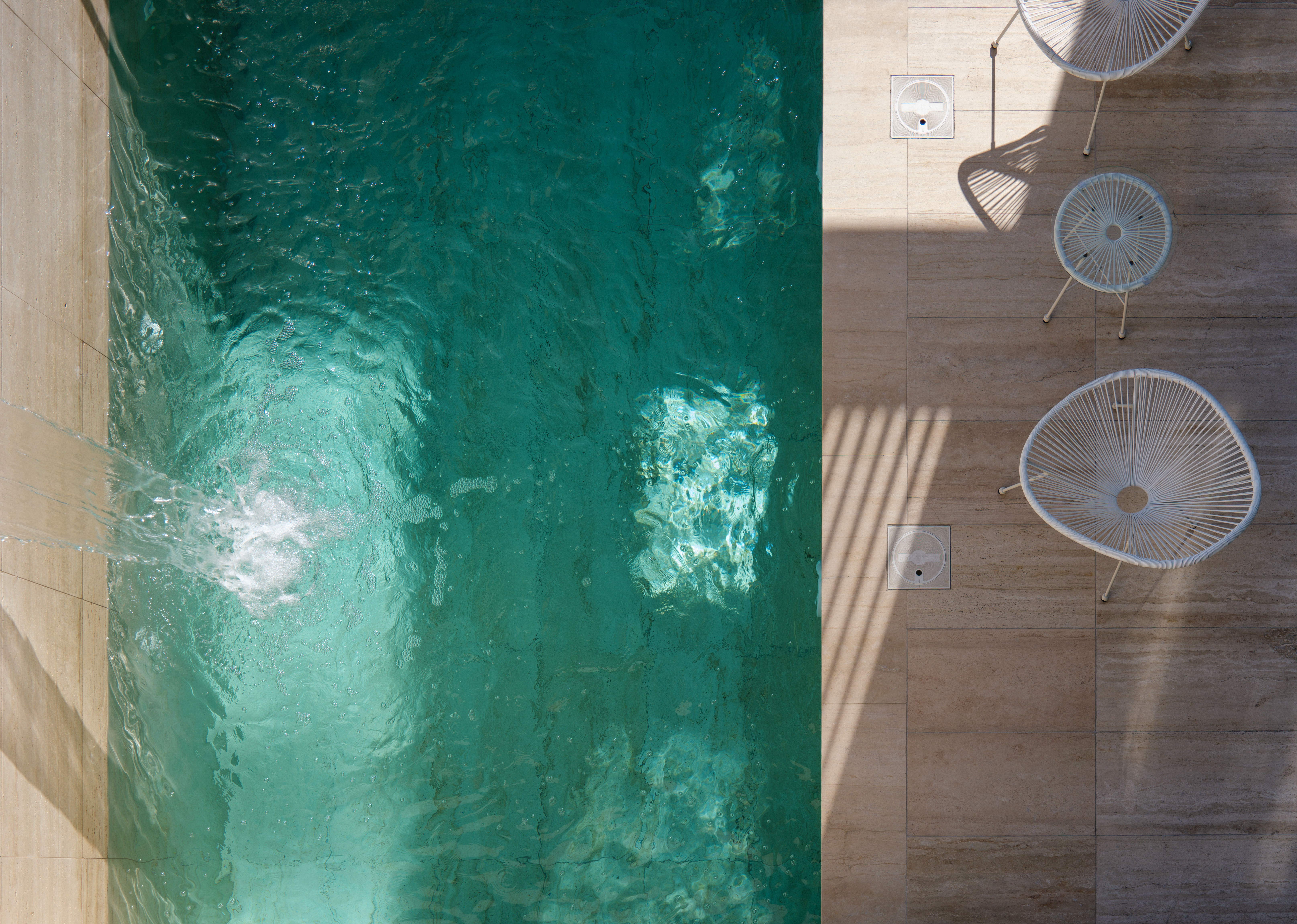 The villa is elevated on a travertine plinth, an architectural choice that extends its presence into the landscape. This plinth seamlessly continues beyond the confines of the interior spaces to include an elegantly integrated swimming pool. Strategically placed, the pool is visible from all public areas within the house, ensuring that the calming water vistas are a constant backdrop to daily life. Additionally, the pool contributes to the home's microclimate through evaporative cooling, which lowers the surrounding temperature. The gentle sound of water moving in the pool further enriches the ambience, cultivating a Zen-like atmosphere throughout the property.