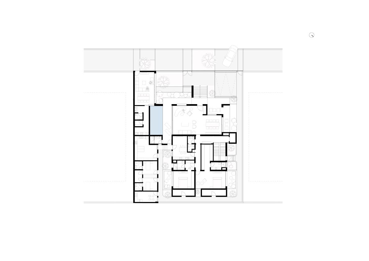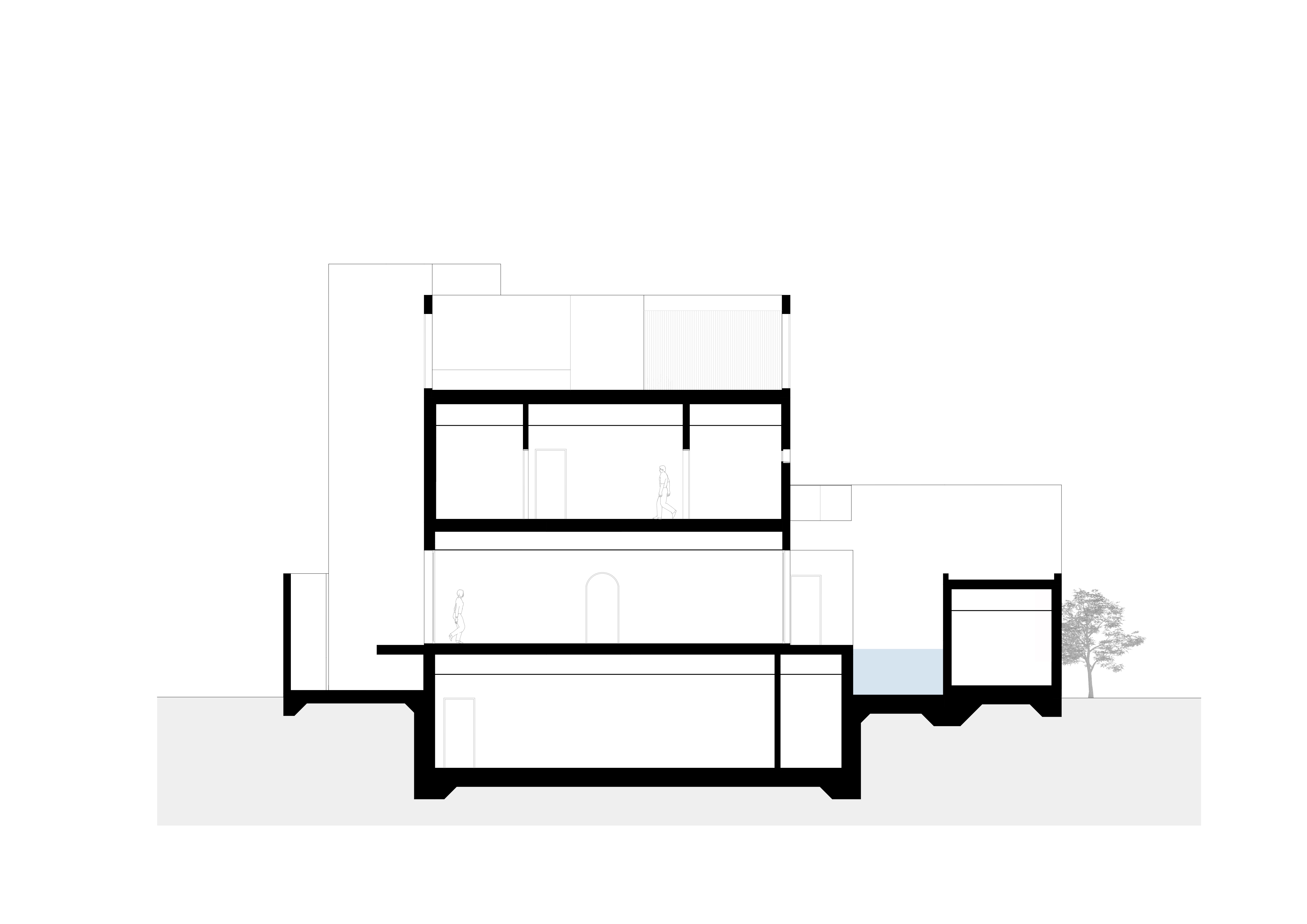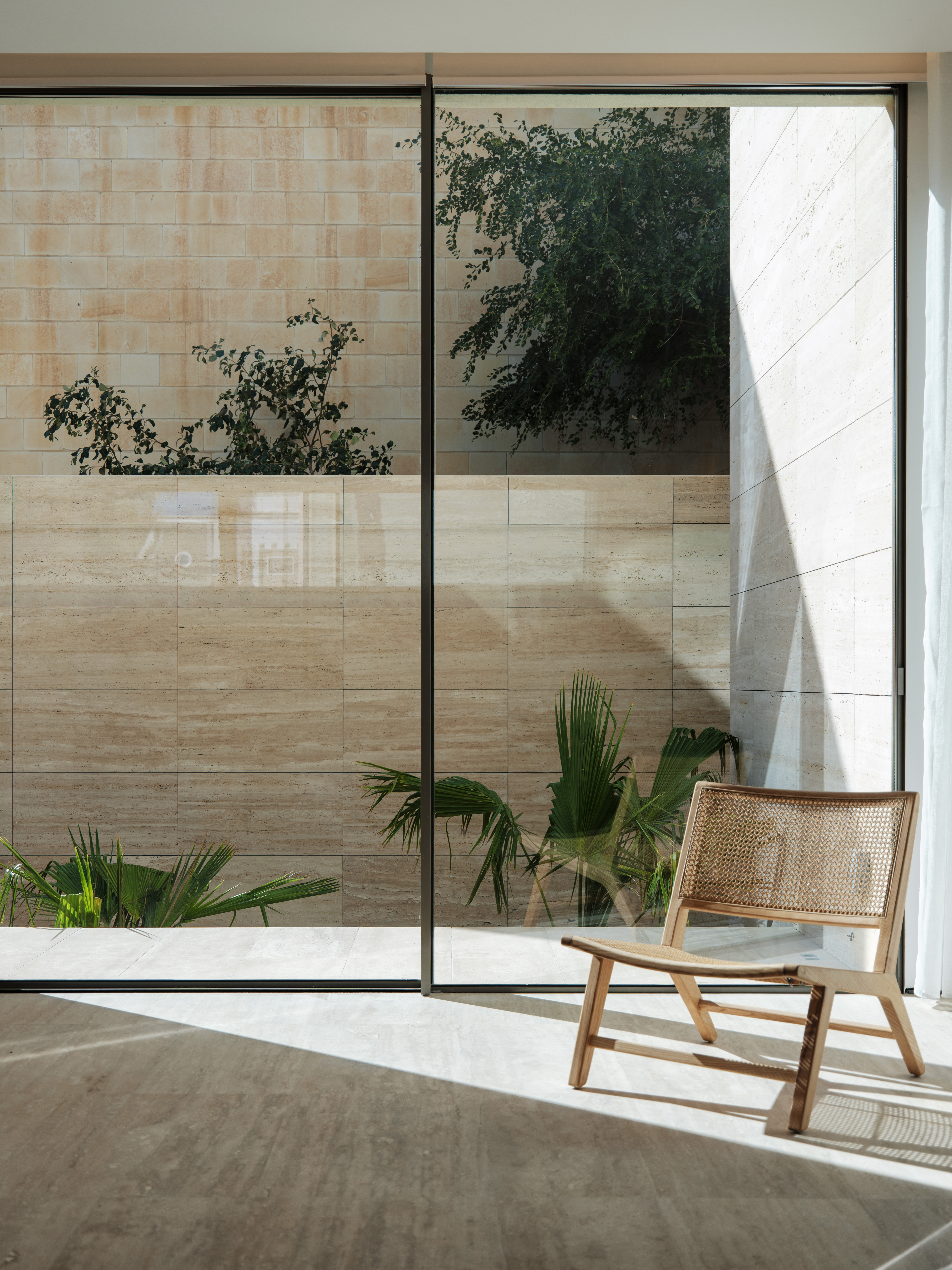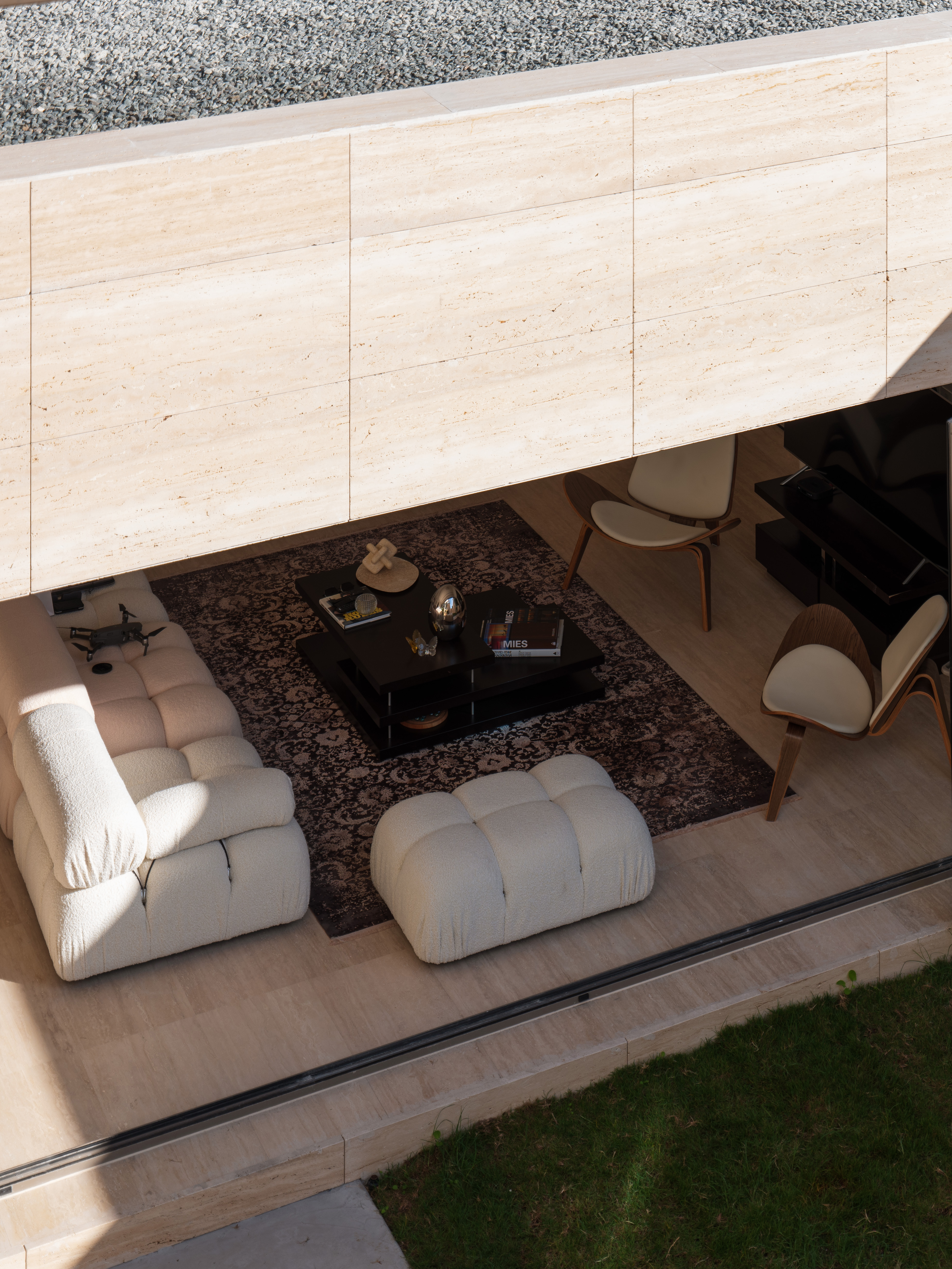 The villa's travertine plinth extends outward, carving interstitial spaces that offer varying degrees of privacy depending on their location. Public spaces, such as the living and dining areas, open directly onto the pool, while private spaces benefit from their own secluded open nooks, ensuring intimacy and seclusion. These strategically placed interstitial spaces balance communal openness and personal retreat, contributing to a holistic design that maximizes functionality and spatial efficiency.