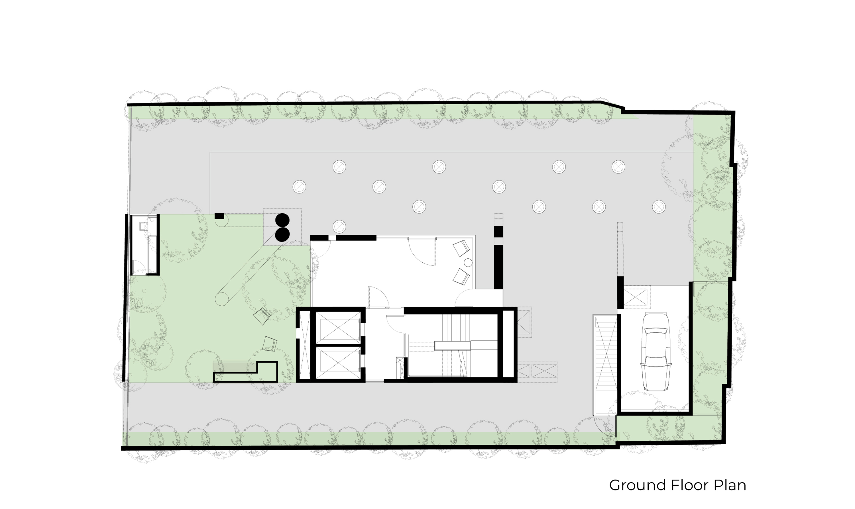 By accommodating the parking within the basement, the street level, up to a height of 11.0m is devoid of residential spaces. Instead, structure and volume are set back from the street and organized within a garden shaded by the cantilevered residential volumes above. At the street level the language of water, trees and low rise, set back spaces create the first point of mediation with the urban condition.