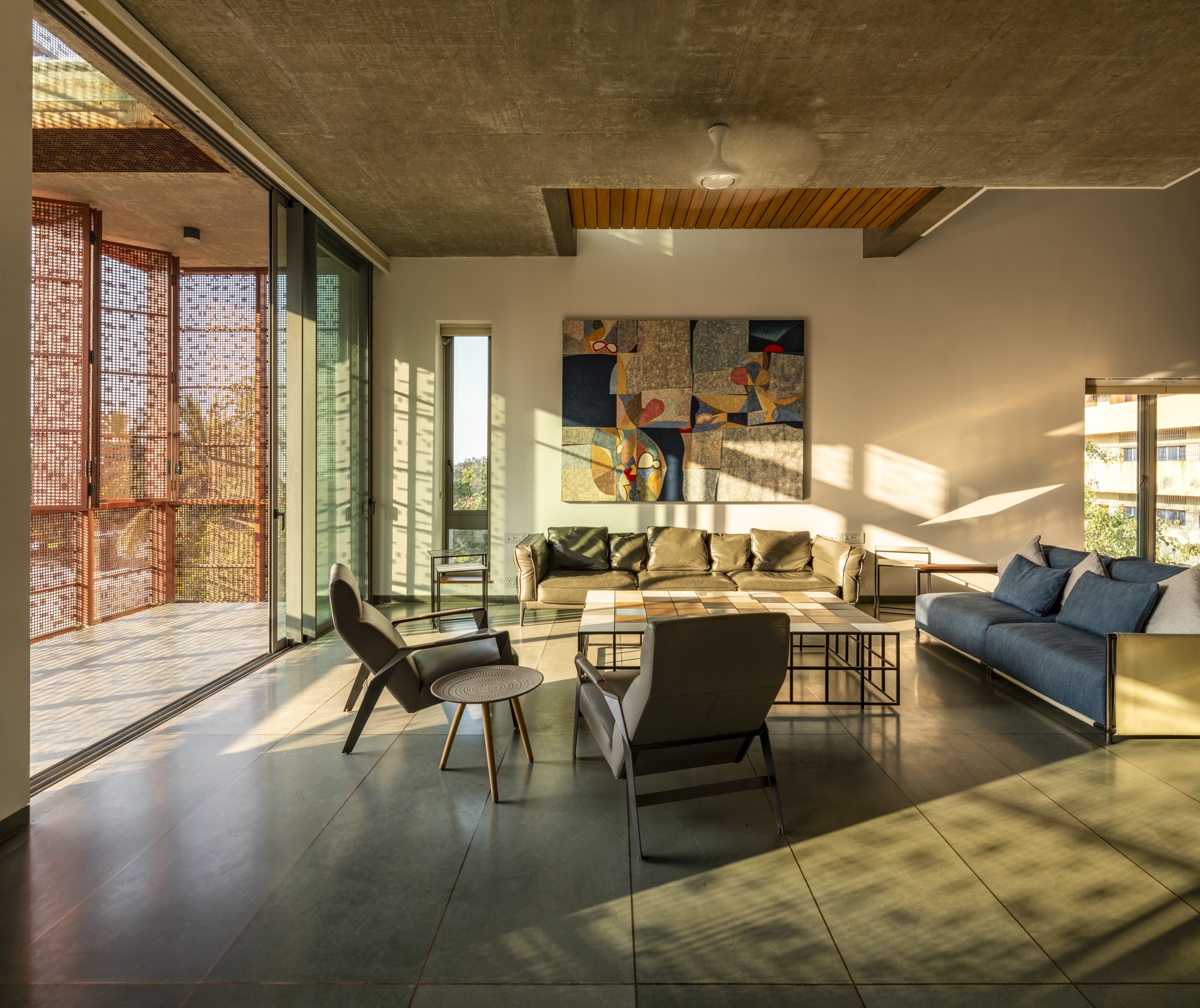 The western edge, with its views of the sea, and its propensity to be subjected to the maximum force of the elements is organized as a series of deep shaded verandahs with fixed and operable screens. The Verandah spaces shift profiles within this tall void, based on the relationship with the interior, and each bungalow develops its own proportion of verandahs’. The operable screens create privacy and shading making those spaces perennially habitable.