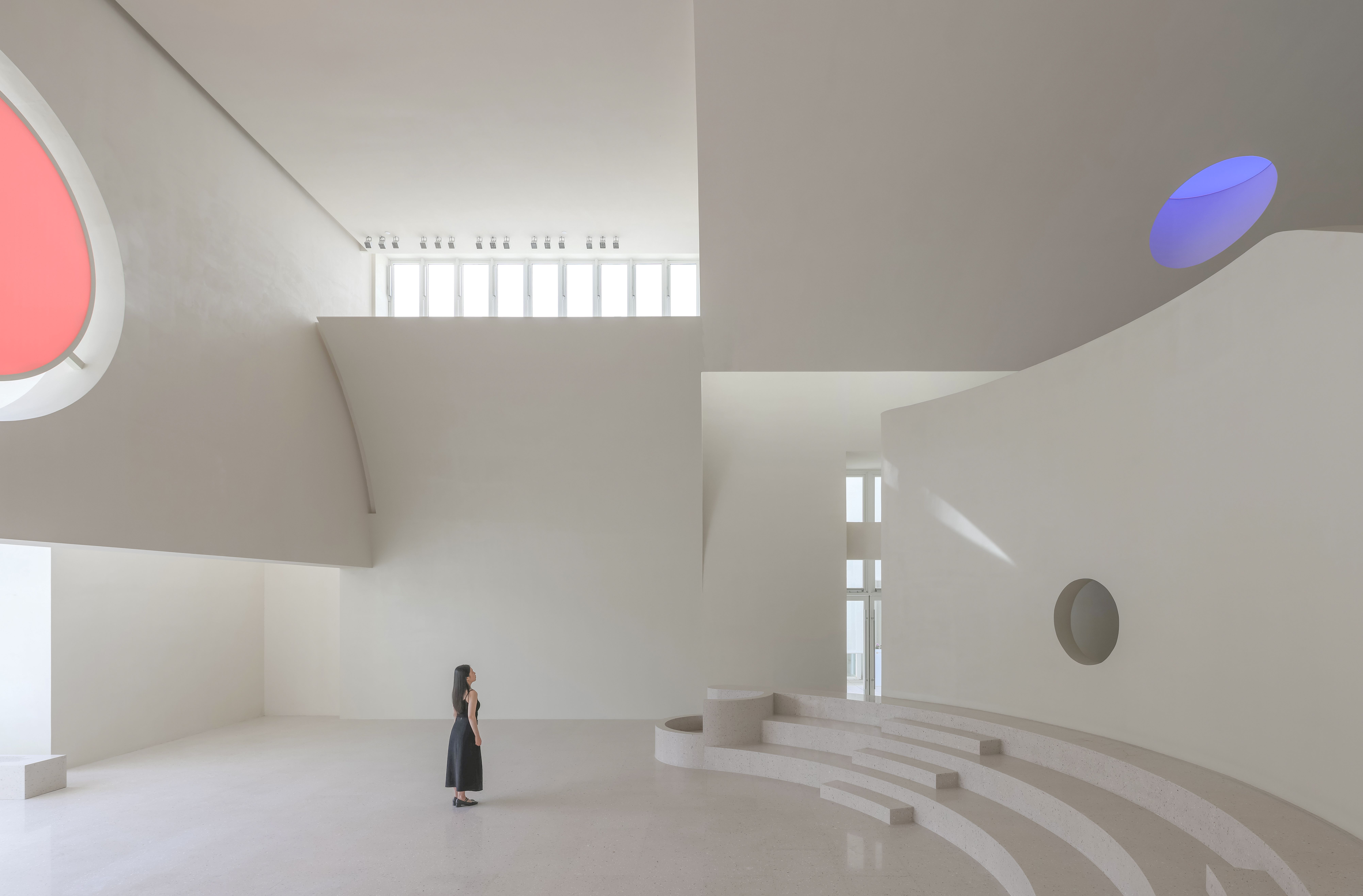 However, inside the main mountain’s lobby, there will be a highly saturated lighting design. Under a blue background, the red sun shines, and at this moment, it is the resurrection of Rothko. At this moment, behind the ever-changing materiality seen from outside, an immediate sanctity different from pure white is born.