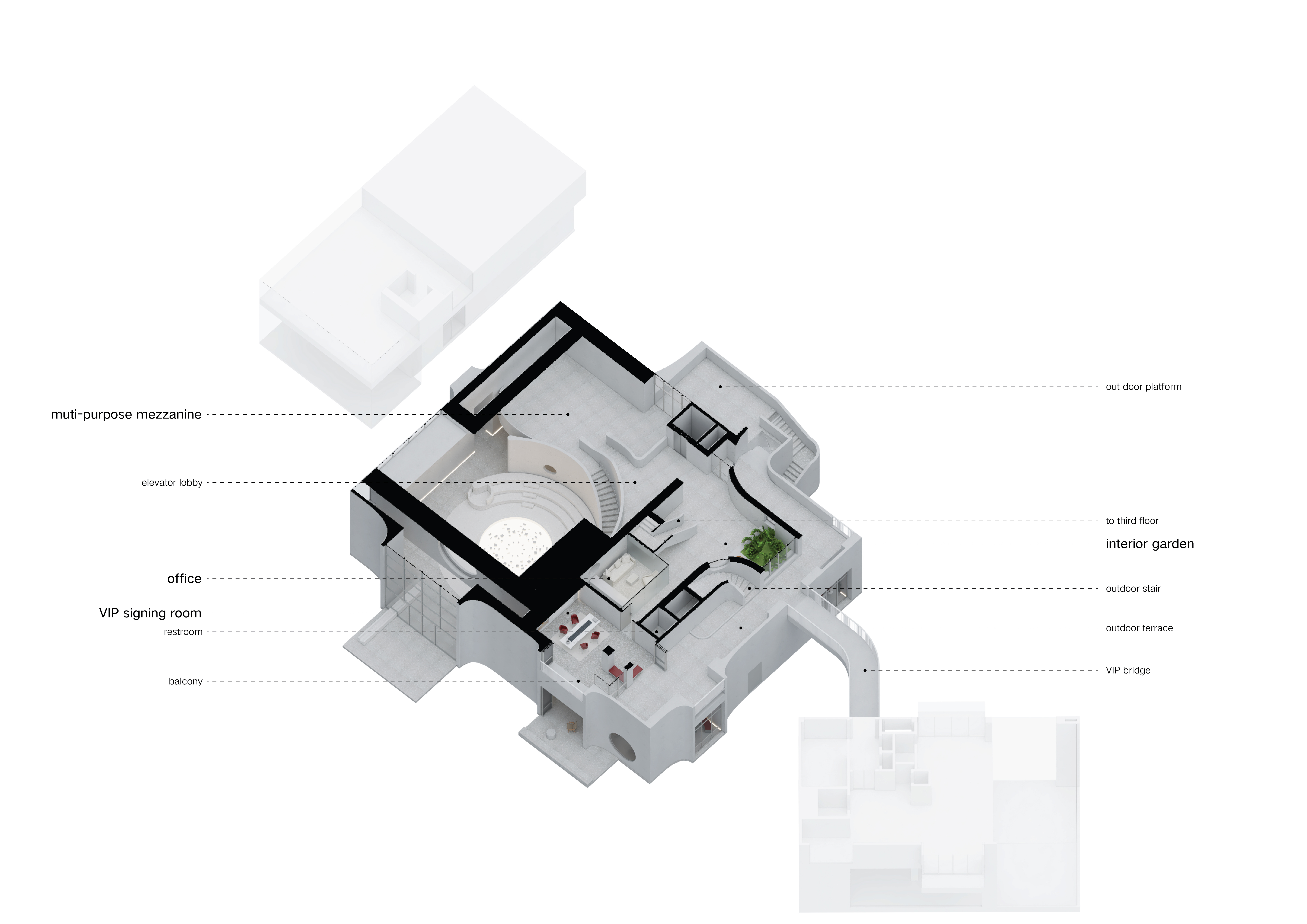 Among the three buildings in the original plan, the east and west auxiliary buildings serve as reception and office areas, while the central main building is the core of the art center. The east and west auxiliary buildings are the secondary mountains, and the main building is the primary mountain. The sea is created in front of the main mountain. Walking along the boardwalk on the sea, one enters the main mountain’s lobby. The sea also flows into the lobby like a tide. Inside the lobby, there are two routes to climb the mountain. One route heads east, first entering the coffee reception area, passing through the open negotiating area, reaching the second-floor overseas Chinese exhibition area, and then arriving at the outdoor seating area. Here, a sky bridge connects to the secondary mountain, and then an outdoor staircase leads to the third-floor multi-functional hall’s external platform. Another route climbs the large steps to the mezzanine, then to the second floor, or takes the elevator directly to the third floor. After passing through the multi-functional hall, this route merges with the first one at the platform, and both continue up the outdoor stairs to the roof, where a hidden small coffee garden offers a panoramic view of the entire town.