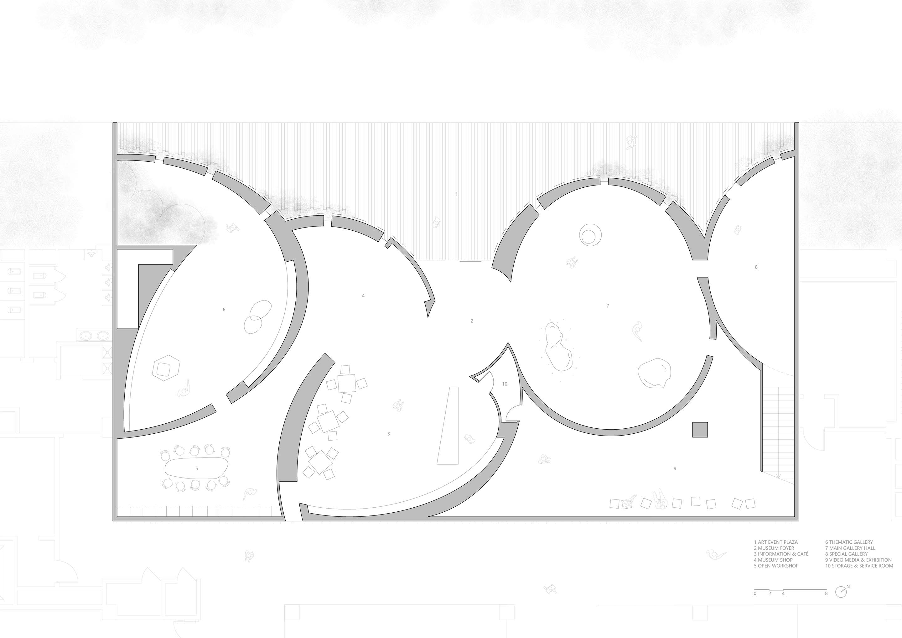 Architects Jenchieh Hung and Kulthida Songkittipakdee, founding principals of HAS Design and Research, present a fresh cultural vision through their innovative design. Drawing inspiration from Anhui’s traditional architectural forms, they reinterpret elements such as roofs and gables, transforming them into a contemporary space where the human spirit and social interaction converge. The design extends the essence of the Hui-style village, featuring a floating, undulating roof that evolves from the inward-facing, fireproof gable into a symbolic structure that opens outward to embrace the public. This continuous form creates a seamless indoor environment for artistic expression, housing art exhibitions, galleries, workshops, multimedia rooms, design salons, and cafés. The architecture flows effortlessly into the interior’s curving walls, offering a graceful translation of tradition into modernity.