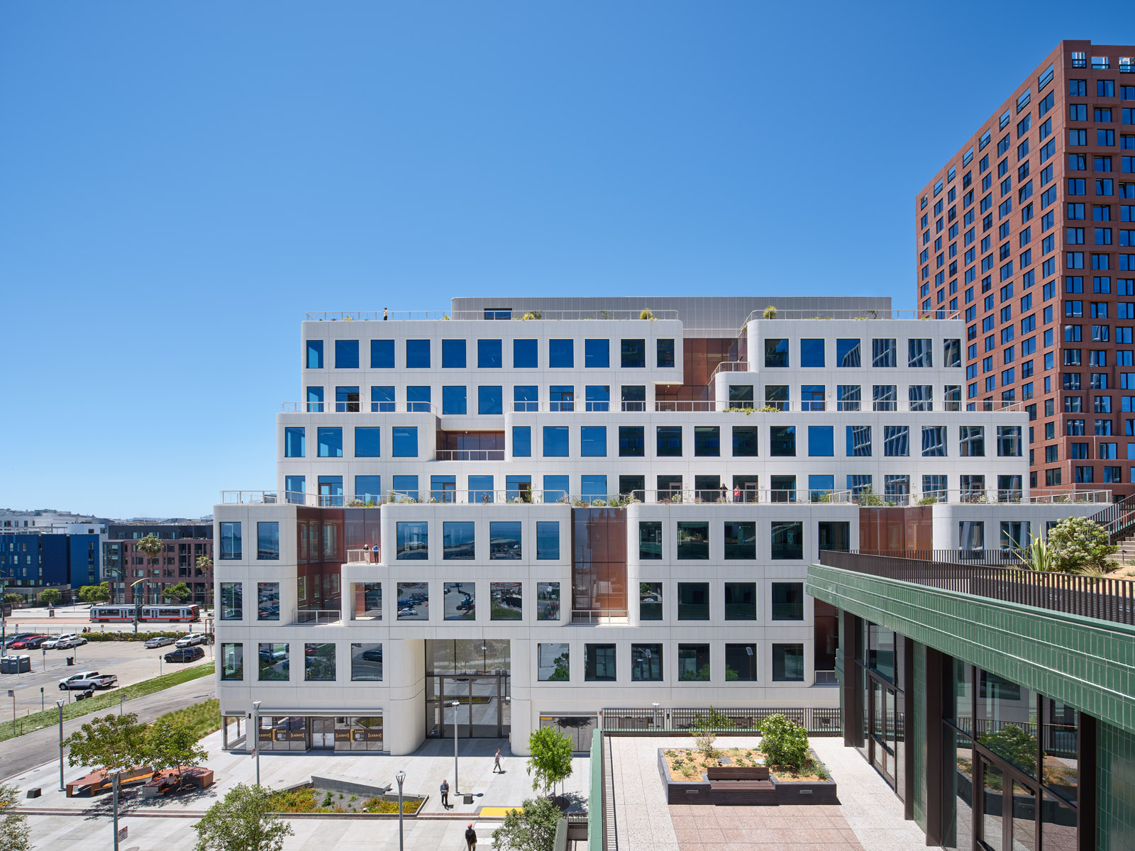 WORKac's Building B is part of the 28-acre Mission Rock redevelopment project led by Tishman Speyer and the San Francisco Giants. This new neighborhood replaces a former asphalt parking lot, providing unprecedented public access to San Francisco Bay and introducing over 500 new homes and 600,000 square feet of retail and office space to the city's Central Waterfront. The first phase of Mission Rock features China Basin Park, a new 5-acre public park designed by SCAPE that opened in April 2024, and four new buildings, each designed by an internationally renowned architecture firm. In addition to Building B Phase One's buildings include The Canyon, a residential building designed by MVRDV that opened in June 2023, the new home of Visa's Global Headquarters designed by Henning Larsen that opened in June 2024, and Verde, a new residential building designed by Studio Gang that opened in June 2024. The buildings echo the dynamic San Francisco topography with their ecologically conscious designs. The ground floor features an extended storefront with an animated glass curtain, its inviting folds offer comfortable seating for the public to relax and enjoy the vibrant street life Mission Rock offers.