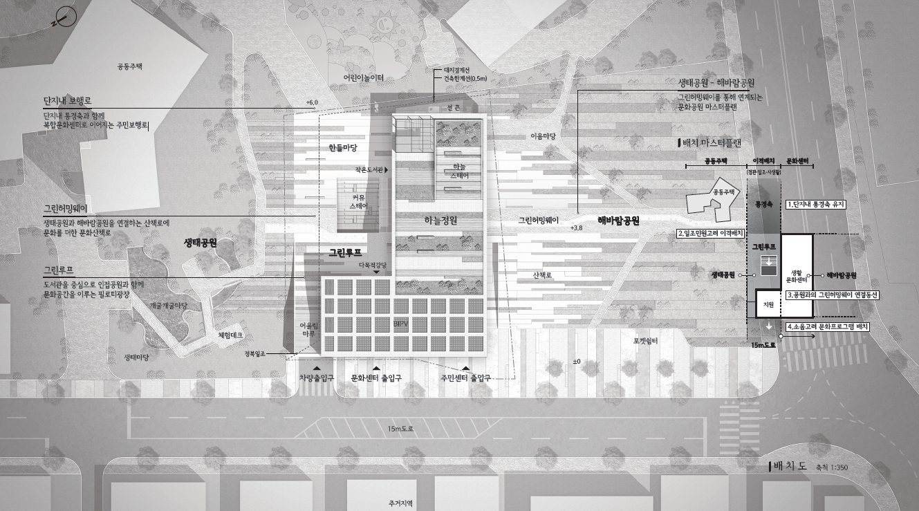 기존 공원의 녹지 환경을 유지하는 공간 계획으로 주민의 일상에 새로운 생활문화공간을 제안합니다.