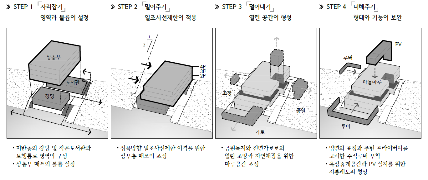 따라서, 공원이라는 장소적 맥락이 가진 긍정적 요소들을 주민들을 위해 마련되는 공간에 충실하게 반영하고, 요구되는 다양한 용도의 복합적 기능들을 유기적으로 조합하여 공원의 연장선상에 일체화된 생활문화센터를 계획하고자 하였다.