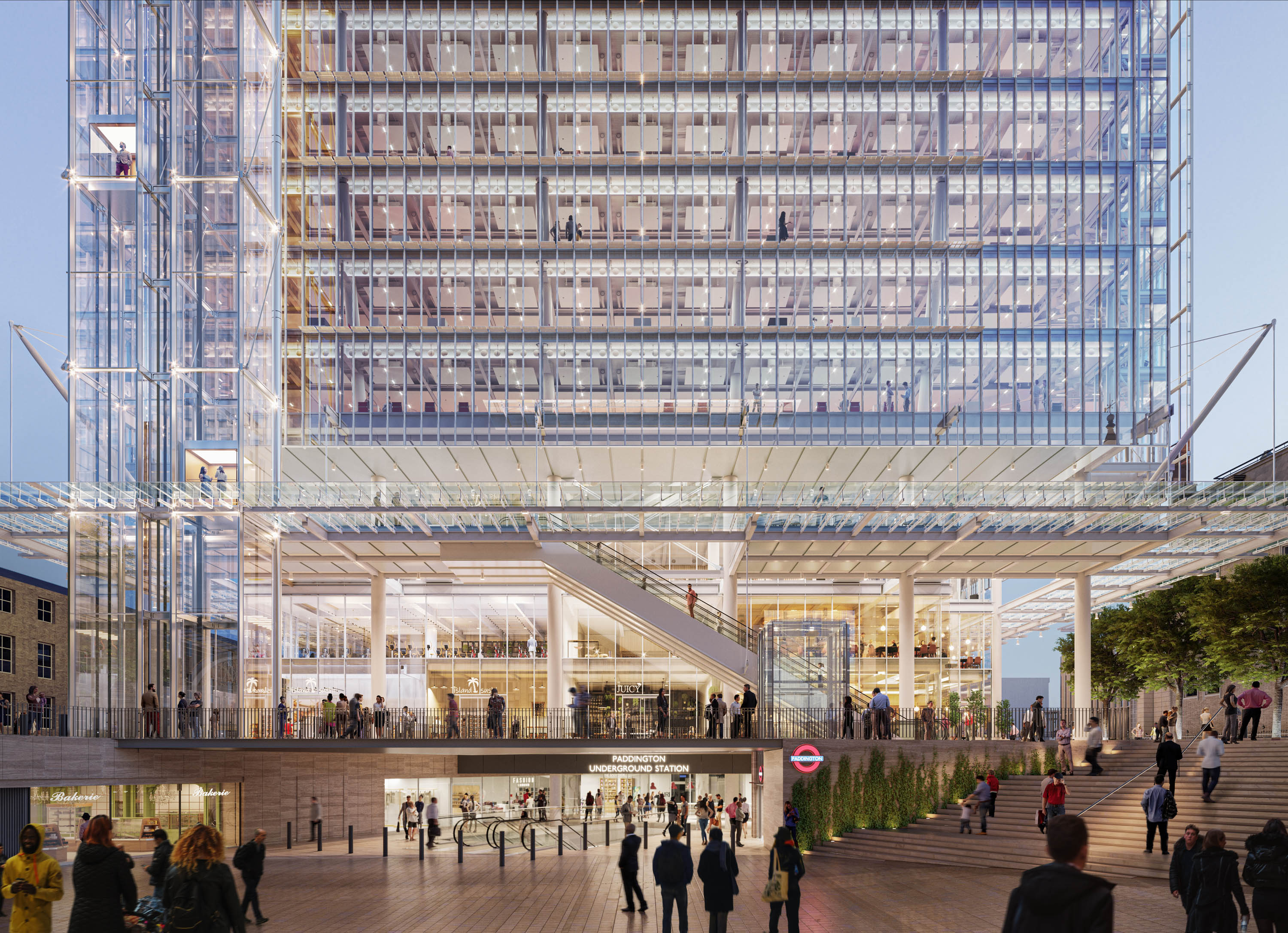Paddington Square 17-storey mixed use building will float above with ground floor. Facades under the building will be set back to maximize the public realm. A balanced mix of restaurants, bars, cafes and shops will animate the Street and Concourse levels.