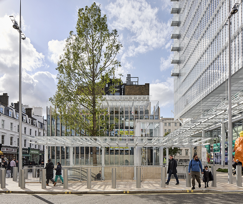 Below ground a new and much enlarged ticket hall will be created, accessed from the piazza and providing a visually dynamic and spacious entrance into the combined Bakerloo and District & Circle line underground station. Step-free access is provided to all levels and the escalator capacity will be doubled.