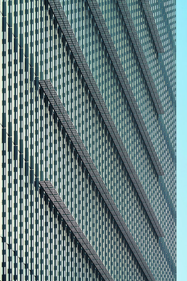When you are standing in the Piazza in front of the station, you will look up and see a square screen of over 50 by 50 meters, expressing the geometry of cube. This screen is the double skin facade of the office building to protect the solar screening venetian blinds. This system makes the building highly efficient to both save energy and provide natural daylight to penetrate deep into the office floors.