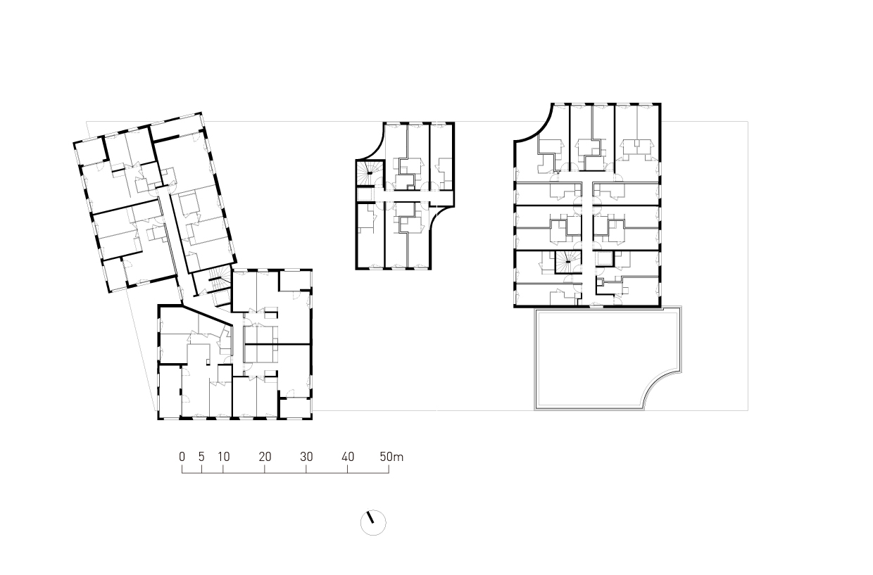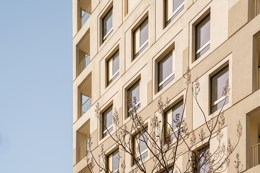 Though courteous, the Formes Hautes are no less assured for, even if the approach is reparative,it is above all forward-looking. The architecture is strong, determined, protective, open, porous,appropriable, and transformable. It has been designed for the long term: the generous structuralgrid makes possible the reversibility of the car parks into a public or cultural facility (district library,cultural center), the evolution of housing, and student cells can all be easily transformed intofamily fl ats. Prefabricated façade modules are inserted into these grids, which in forty or fi ftyyears, could easily be replaced to meet new environmental or socio-cultural challenges.