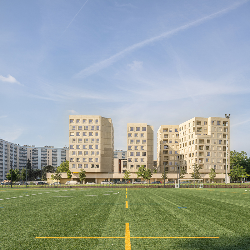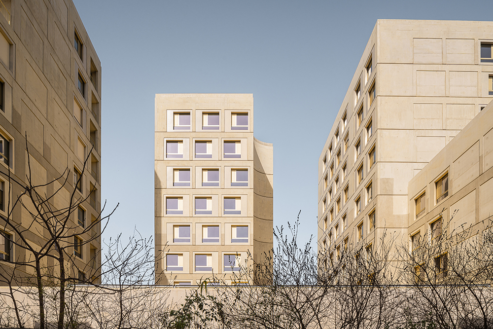 Though courteous, the Formes Hautes are no less assured for, even if the approach is reparative,it is above all forward-looking. The architecture is strong, determined, protective, open, porous,appropriable, and transformable. It has been designed for the long term: the generous structuralgrid makes possible the reversibility of the car parks into a public or cultural facility (district library,cultural center), the evolution of housing, and student cells can all be easily transformed intofamily fl ats. Prefabricated façade modules are inserted into these grids, which in forty or fi ftyyears, could easily be replaced to meet new environmental or socio-cultural challenges.
