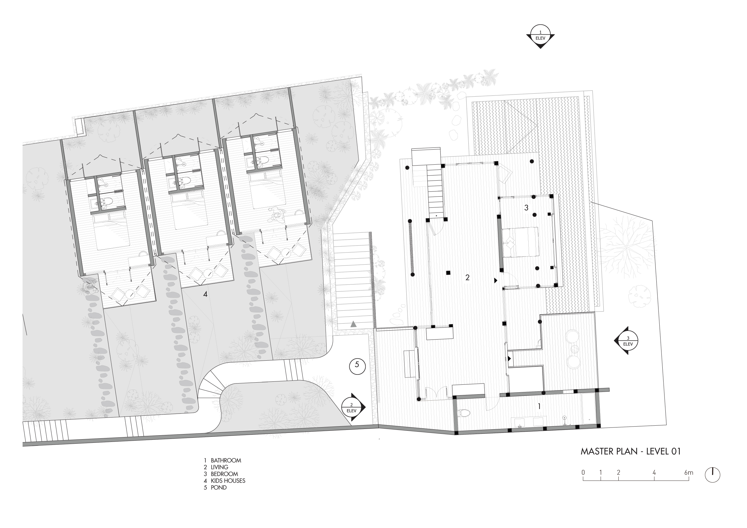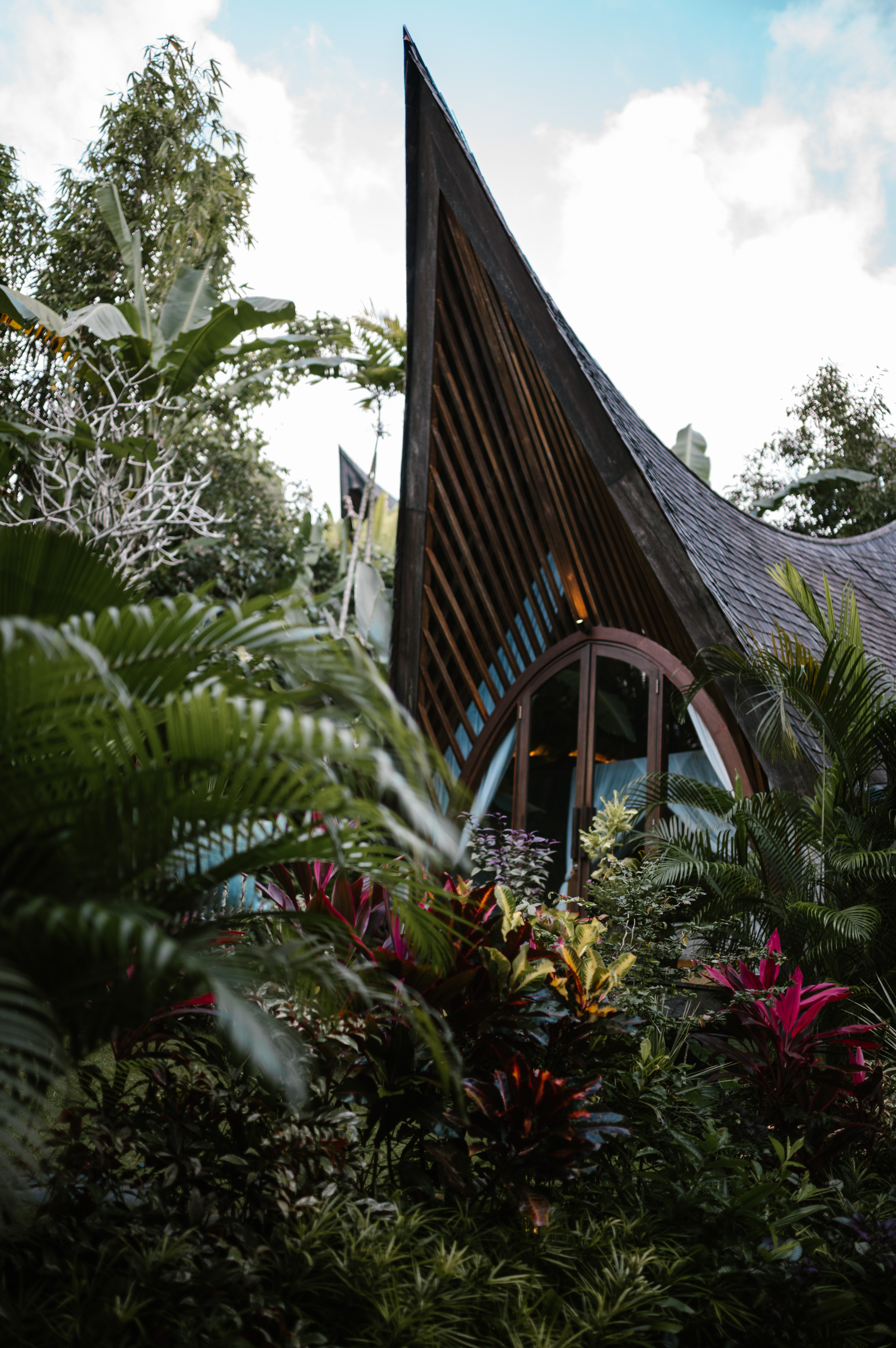 The ensemble includes a main house and three guest houses. Inspired by Sumatran architecture, the guest houses feature pointed roofs and arched windows that balance these dynamic forms. Strategic use of glass and wide overhangs help manage the indoor climate, protecting against rain and sun while maintaining natural light.