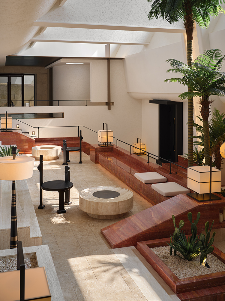 In the central public area, we creatively use an atrium and sunken space to craft a “hidden oasis”. Natural light, cleverly filtering in from above, brings vitality and spirituality to the inward-focused space through light and shadow. The vertical flow of movement, organized by staggered steps, together with freely placed furniture and tropical greenery within arm’s reach, creates a lively and relaxed vacation scene.