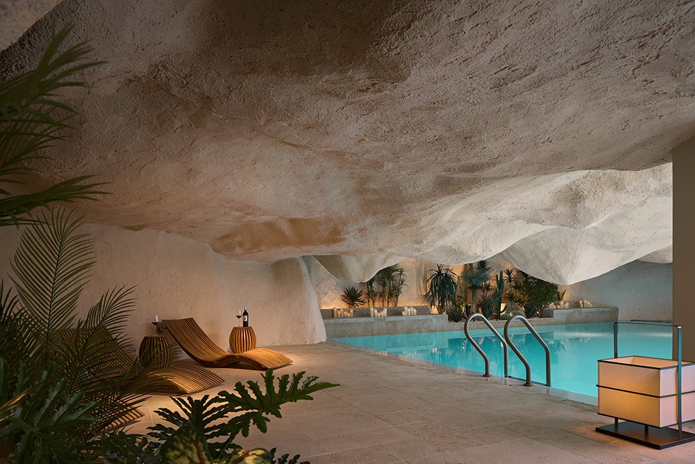 The design of the swimming pool area is inspired by the discovery of a mysterious underground hot spring. Legends of surging underground hot springs stir the curiosity of every adventurous heart. The curves and undulations of the ceiling shape a spectacular scene reminiscent of a natural karst cave. Surrounded by lush greenery, the pool bears our aim to provide guests with a ceremonial entry, as if stepping into an ancient and sacred bathing place and having a profound dialogue with nature underwater.