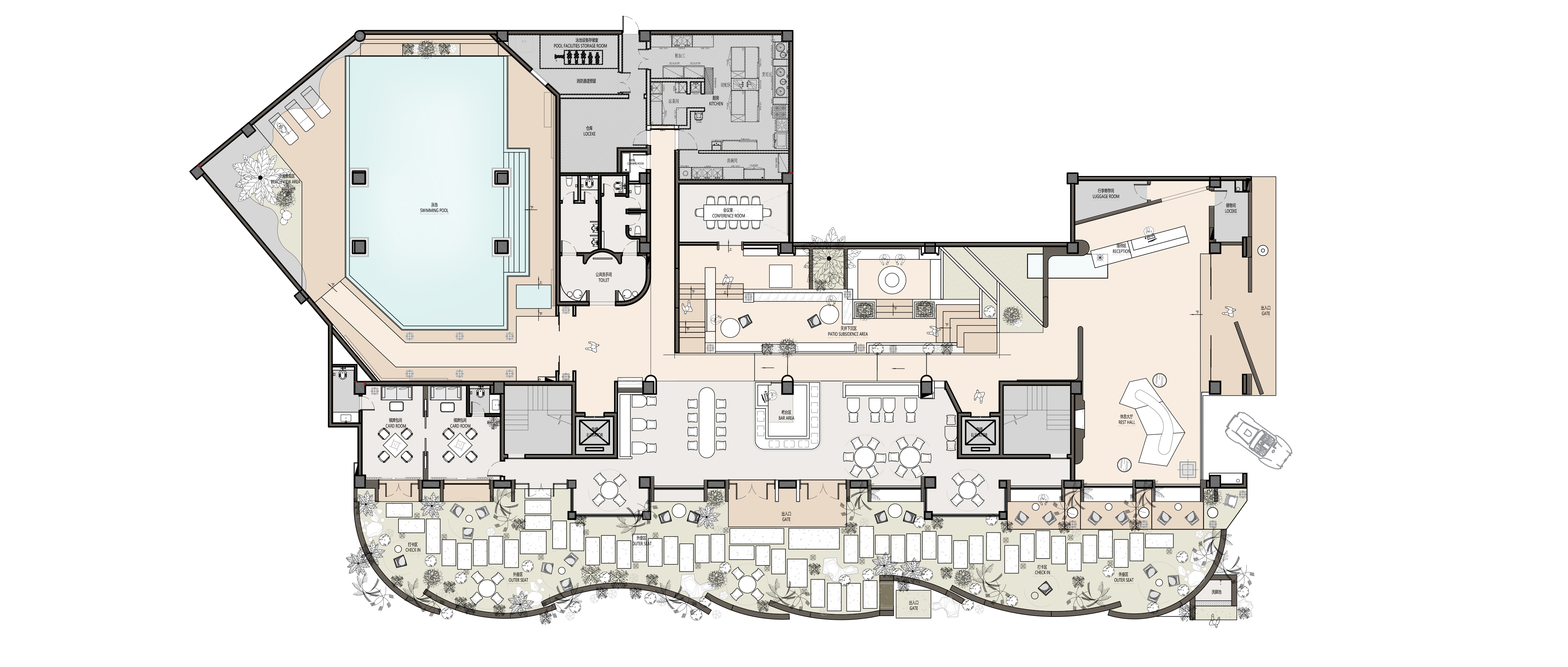 In the central public area, we creatively use an atrium and sunken space to craft a “hidden oasis”. Natural light, cleverly filtering in from above, brings vitality and spirituality to the inward-focused space through light and shadow. The vertical flow of movement, organized by staggered steps, together with freely placed furniture and tropical greenery within arm’s reach, creates a lively and relaxed vacation scene.