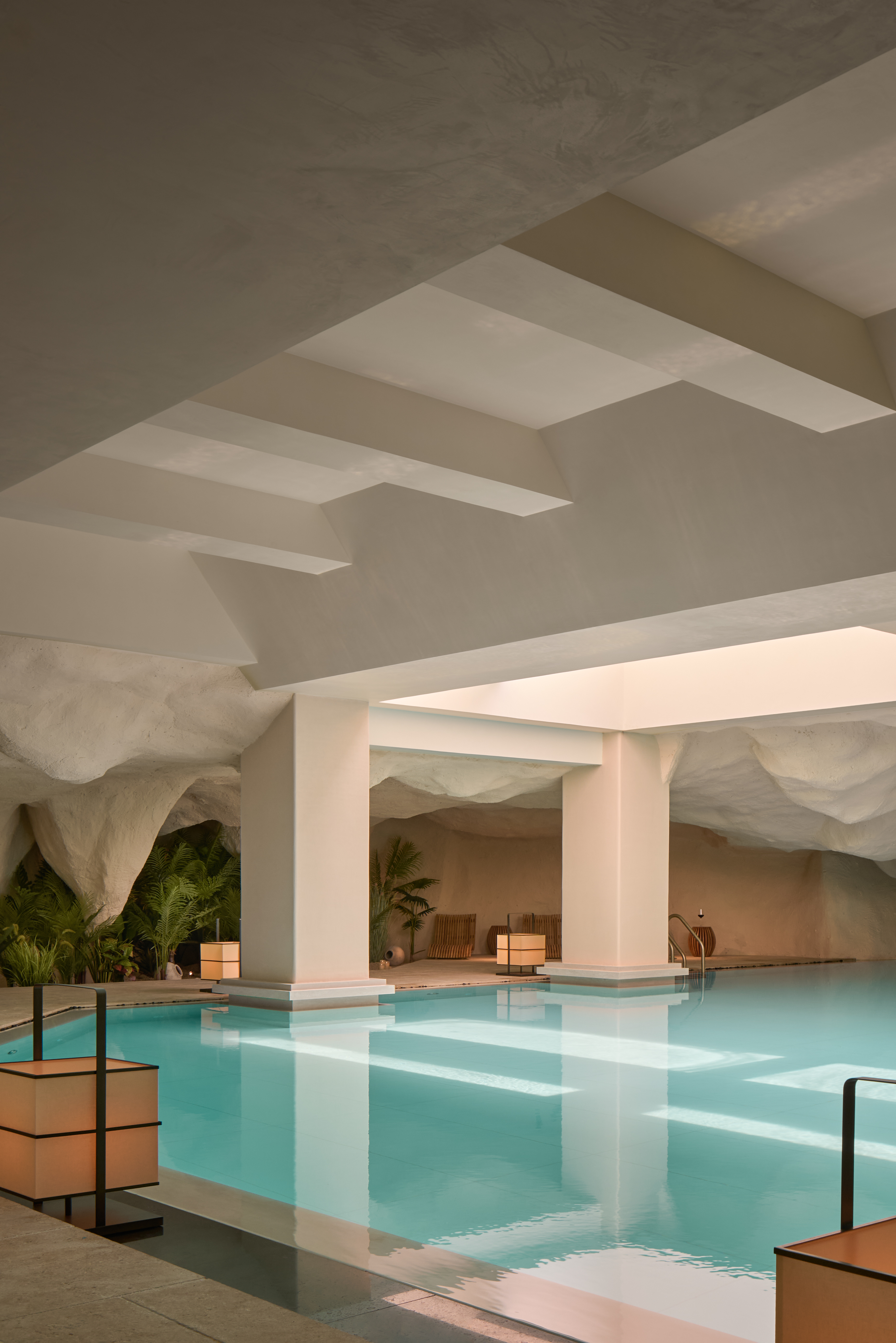 The design of the swimming pool area is inspired by the discovery of a mysterious underground hot spring. Legends of surging underground hot springs stir the curiosity of every adventurous heart. The curves and undulations of the ceiling shape a spectacular scene reminiscent of a natural karst cave. Surrounded by lush greenery, the pool bears our aim to provide guests with a ceremonial entry, as if stepping into an ancient and sacred bathing place and having a profound dialogue with nature underwater.
