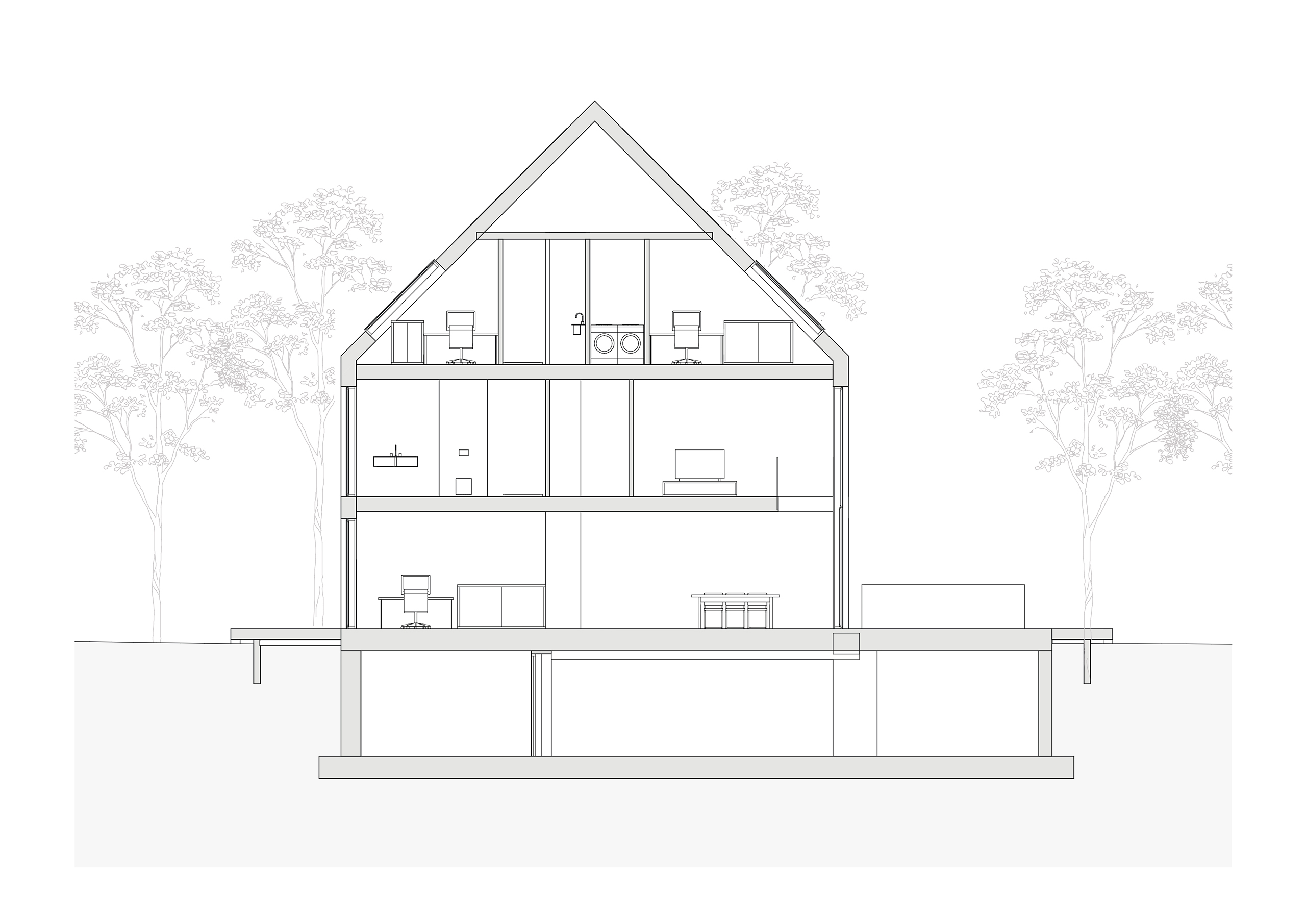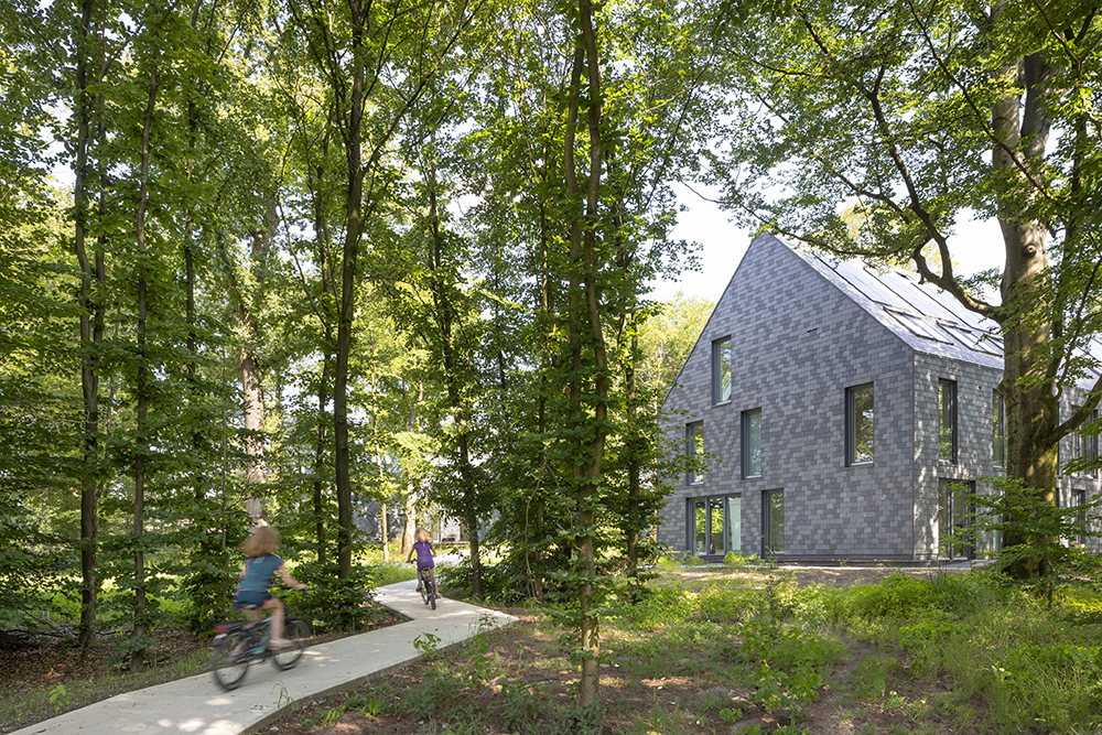 The final stage of the sixteen-year transformation includes a series of three almost-identical residential buildings designed by MVRDV, each comprising seven terraced homes. As dictated by the masterplan’s Image Quality Plan, these adopt the location, shape, and size of buildings that could once be found here, while grey slate walls and roofs identify them as reconstructions. The future owners of these “townhouses in the forest” could choose their favourite floorplan, from a range of possibilities. The homes are raised above ground level, with outdoor spaces that are minimally enclosed: beyond their small projecting decks, they have no garden, but instead an intimate connection to the surrounding forests, with large shared spaces between the homes on both the front and back of the buildings.