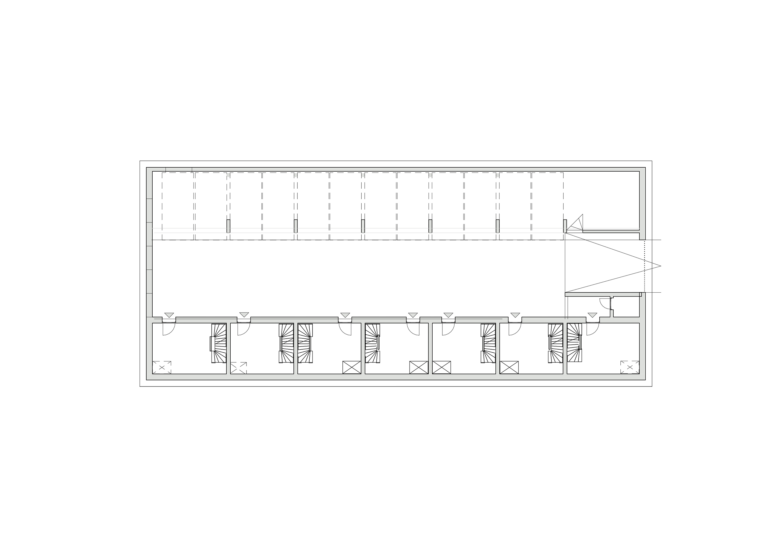 In the latter half of the 20th century, many alterations were made, before all the remaining structures were added to the Dutch list of national monuments. MVRDV and Buro Harro’s masterplan engages carefully with this history: following the rules established by the national monuments register, the existing mostly brick buildings are preserved (in the case of the original German constructions) or transformed (in the case of later Dutch constructions) with alterations such as new doorways and dormer windows made clearly identifiable by their dark grey finishes. Meanwhile, previously demolished buildings are resurrected as buildings of the same shape and size, completed in light grey materials.