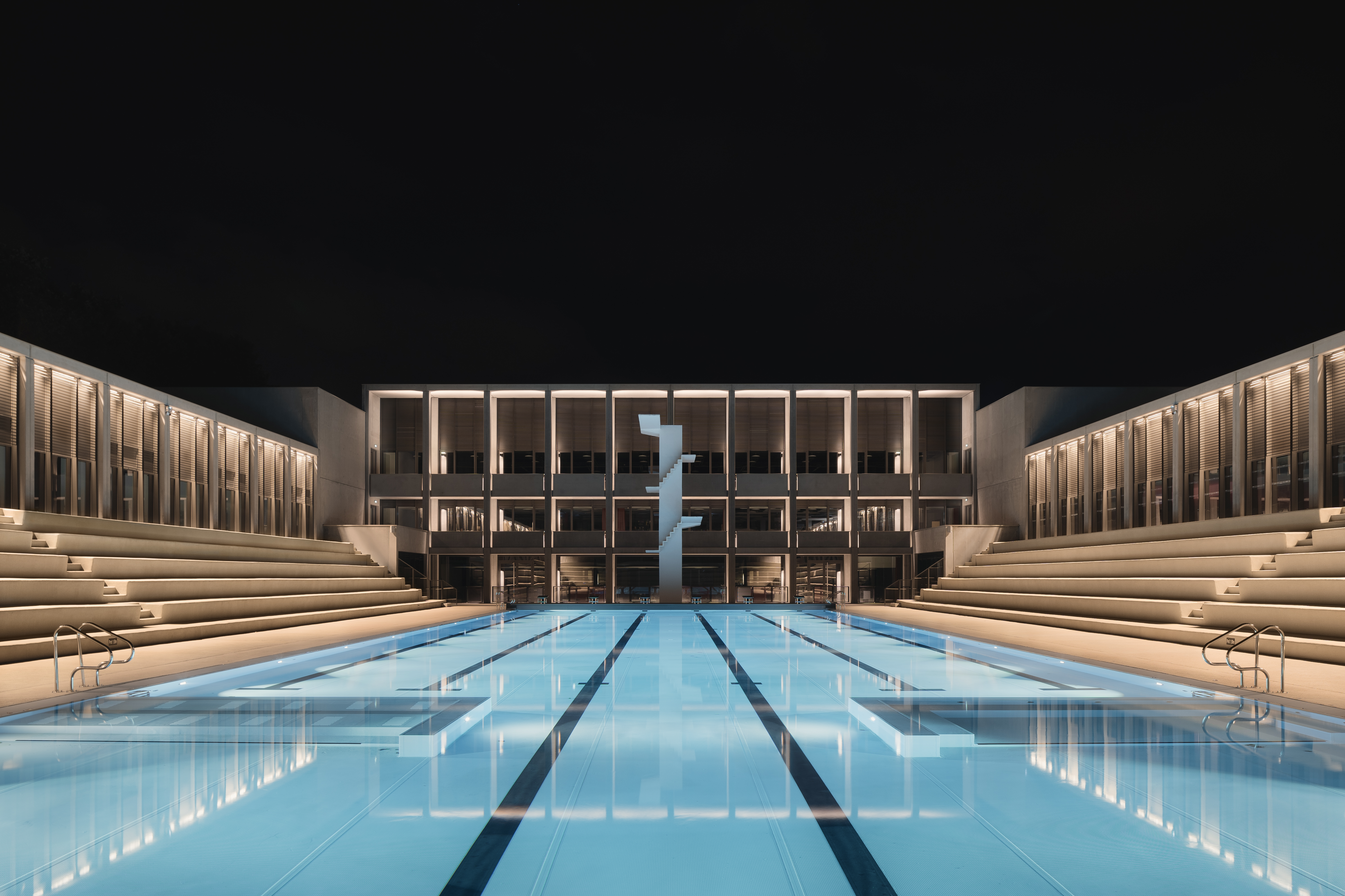 The new buildings, surrounding the exterior aquatic space delimited by the bleachers, create the ideal setting for the existing pool. Their design takes advantage of the 7.50 m grid applied by Tony Garnier to all the projects on the site. This grid is doubled and shifted to avoid the crushed concrete foundations of the former “Athletes' quarter”, preserved as vestiges of the 20th century. The project aims to restore a presentation that matches the pool's heritage value. The redevelopment plan includes restoring the bleachers, foundations, and existing diving platform.