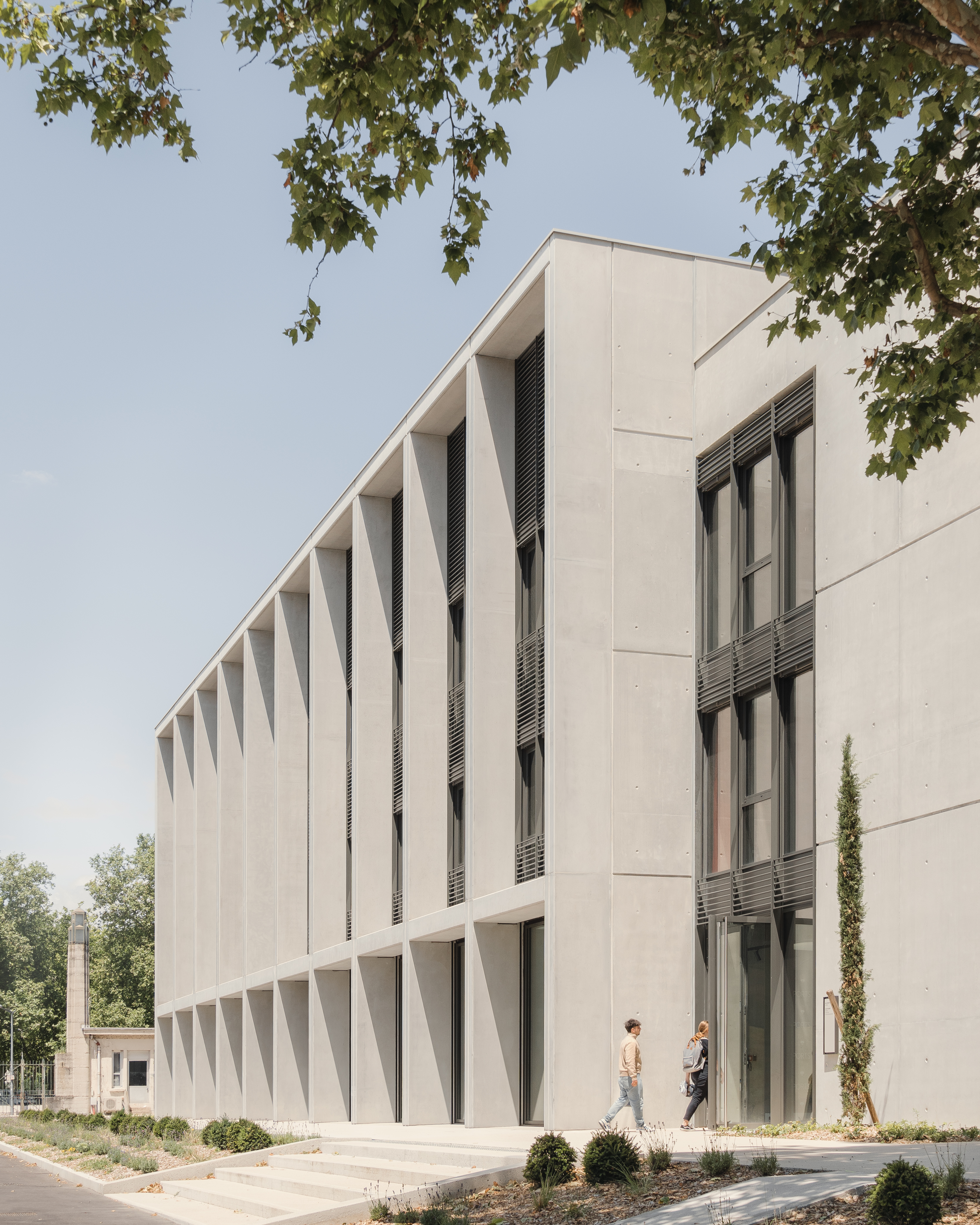 The use of concrete references Tony Garnier, a pioneer in its application. The project's architecture adheres to the principles of concrete porticoes, outlining a regular grid on the two primary facades. These porticoes serve as supports for the elongated girders, allowing flexibility and adaptability for various purposes such as offices, sports areas, and a pool. They provide visible uniformity in the foreground, while in the background, the portico depth varies between 40 cm and 1 m, accommodating diverse uses: a curtainwall facade adaptable to uses and orientations, sunshades on the southern side, and loggias on the north create visual separation between offices and bathers. South of the outdoor pool lies a building that serves as the headquarter office for LOU Rugby. Its bold architecture harmoniously aligns with the site's history as well as from an urban and architectural brief standpoint. Monumental exposed concrete porticoes define the entrance to the stadium on Allée des Lions, refers to the neoclassical style of the original project by Tony Garnier.
