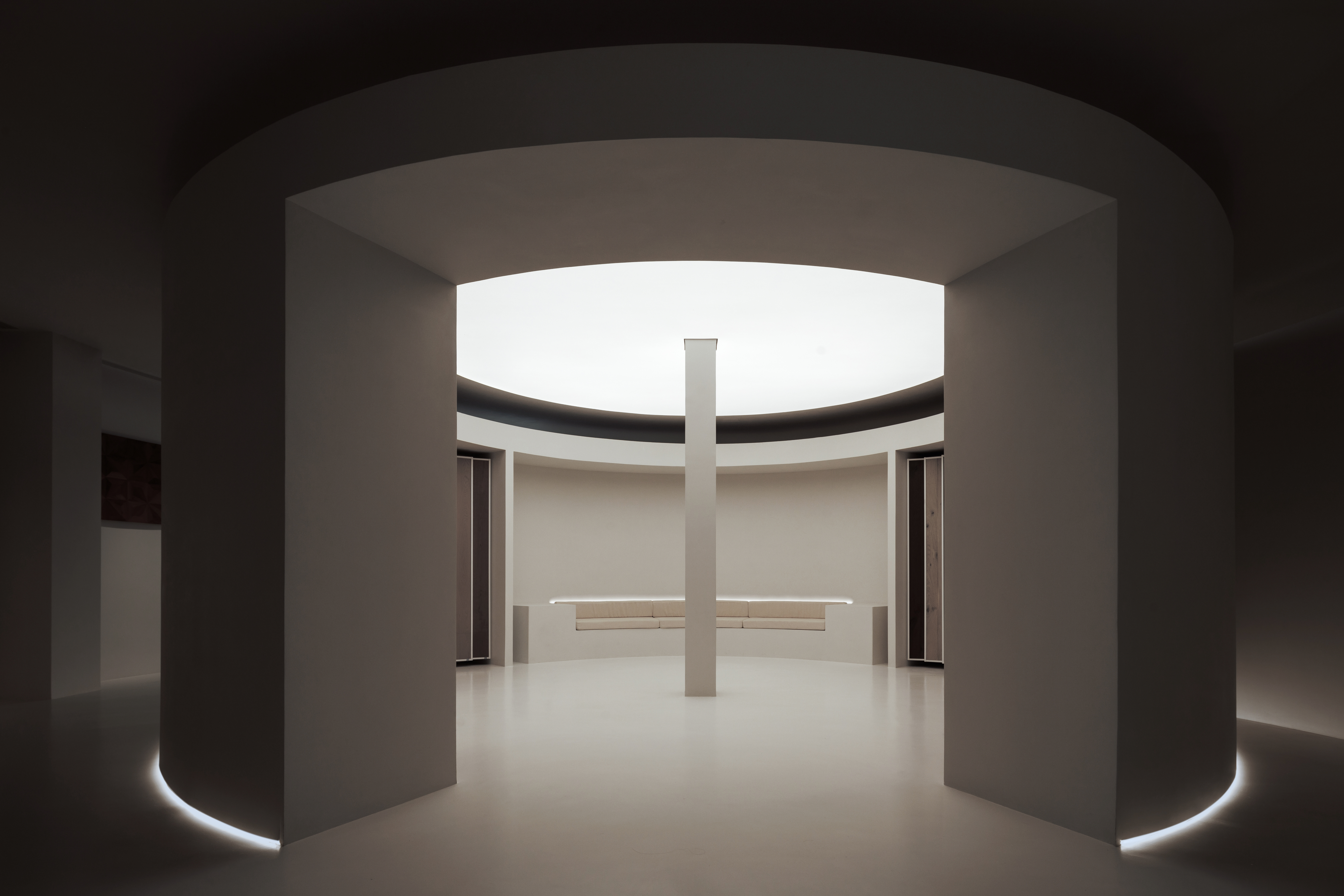 The atrium area, as the core of the product display, creates an absolute spiritual space through its central enlarged column design and the layout of curved display panels. Combined with the skylight effect simulated by the overhead lighting film, it allows visitors to deeply experience the sacredness and tranquility that the space evokes, enhancing their focus and appreciation of the environment.